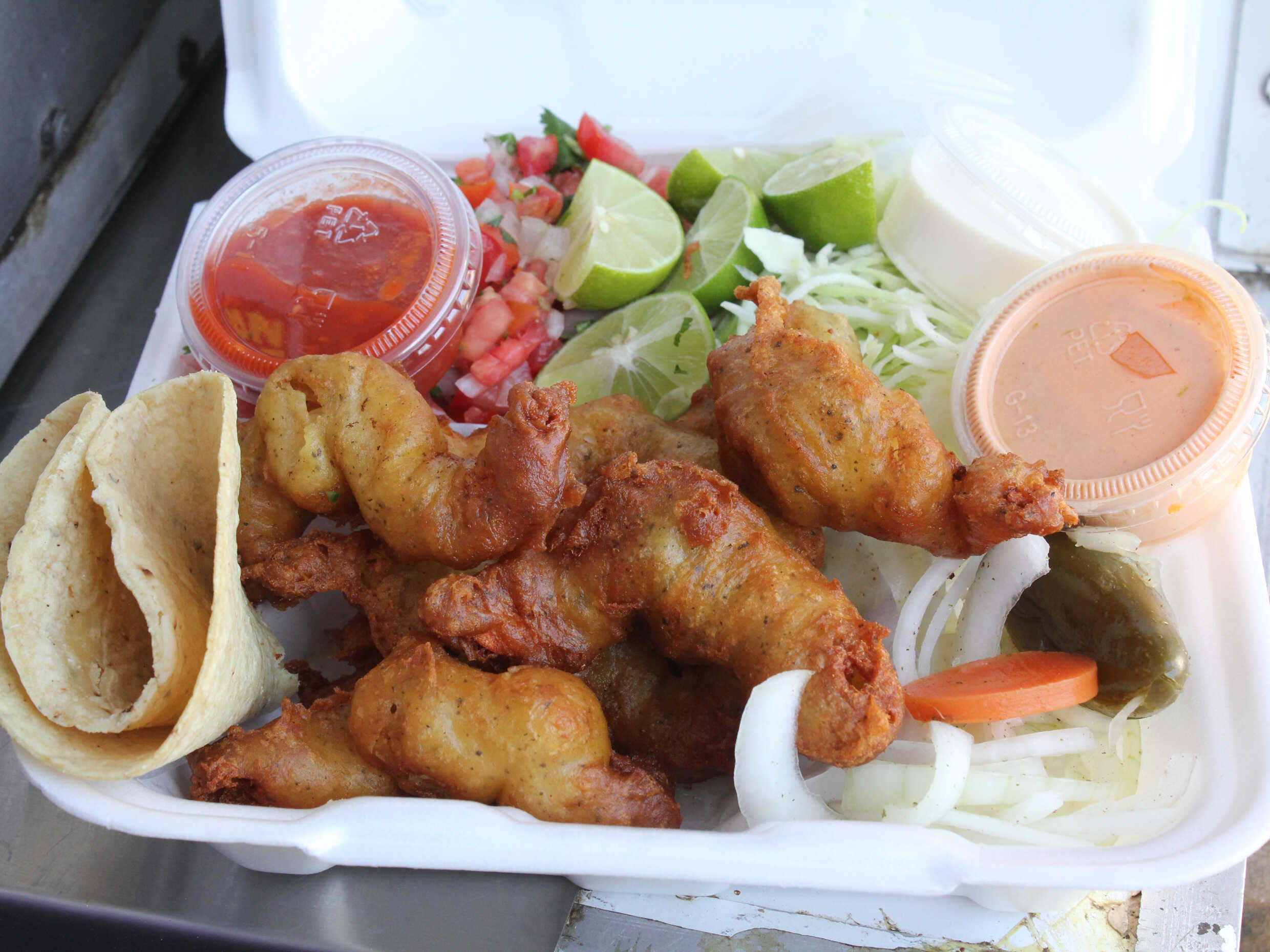 (por unidad )Salsa mexicana acompañada de repollo, limón mayonesa , camarón Platillo personal.