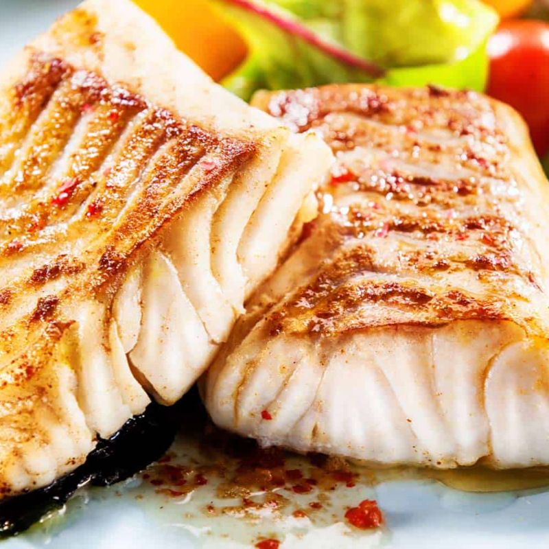 Piezas de pescado cocinado con aceite de oliva cocinado ala plancha