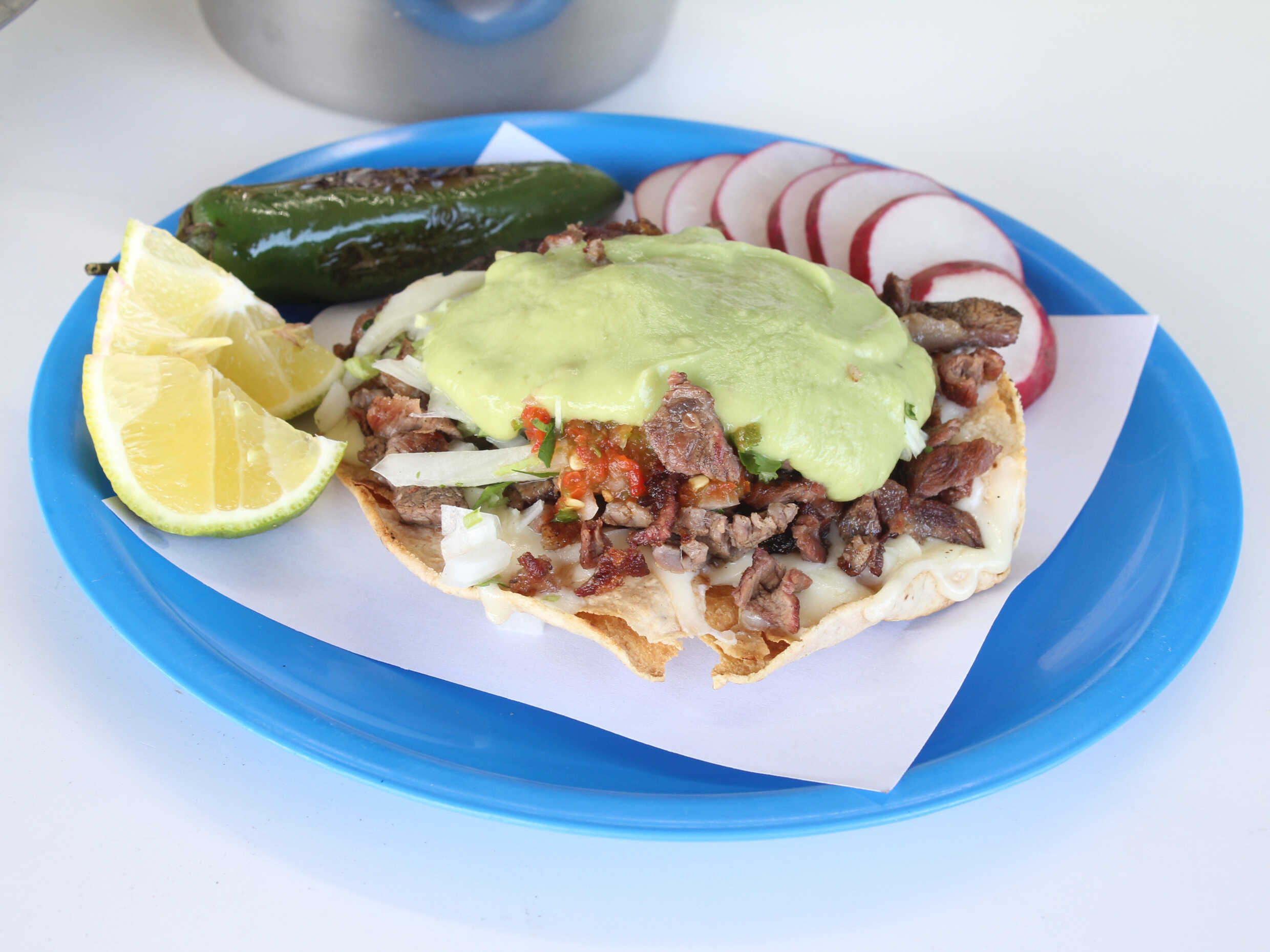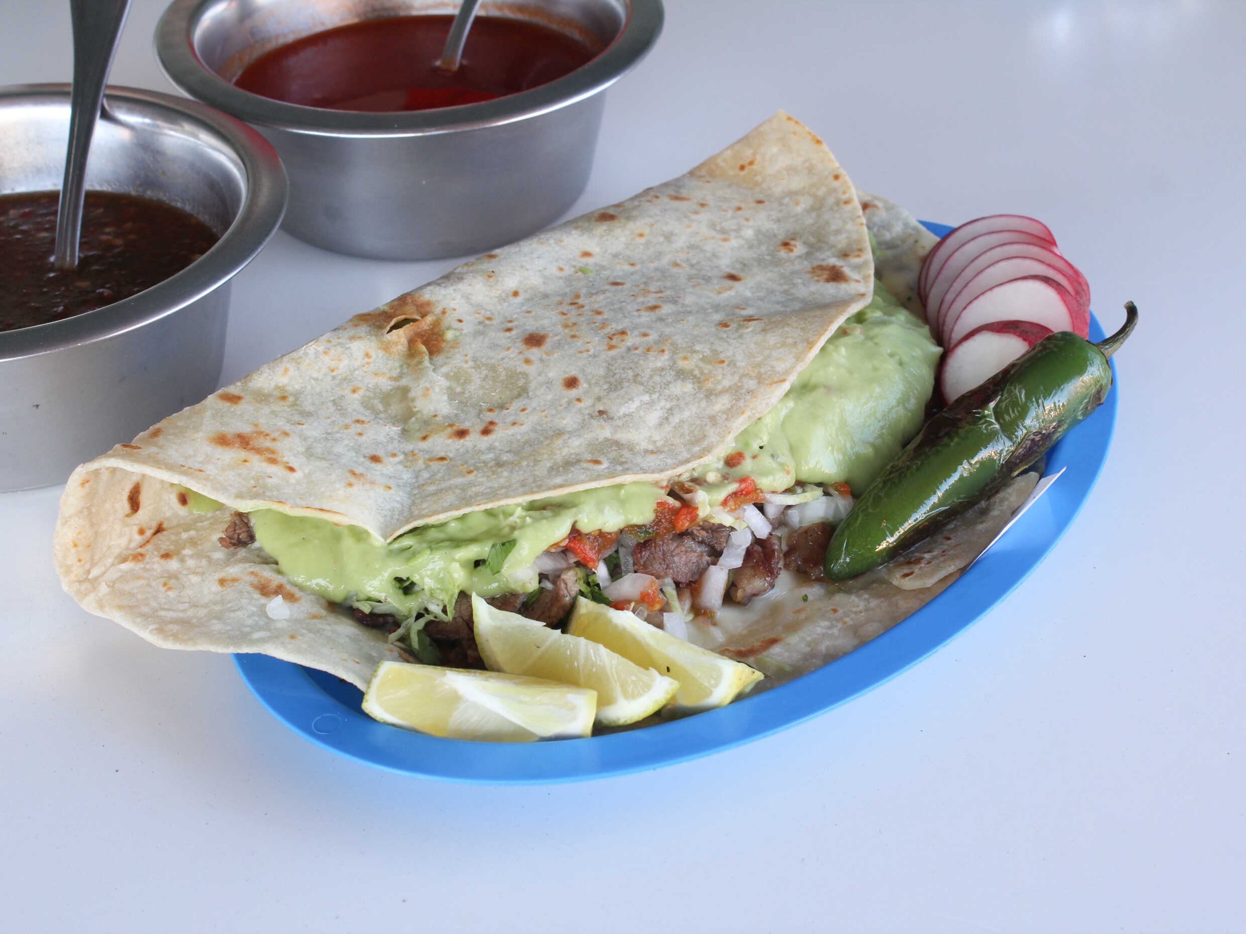 Queso, guacamole, cebolla, cilantro, lechuga, salsa y frijoles. Puede ser asada, adobada o mixto.