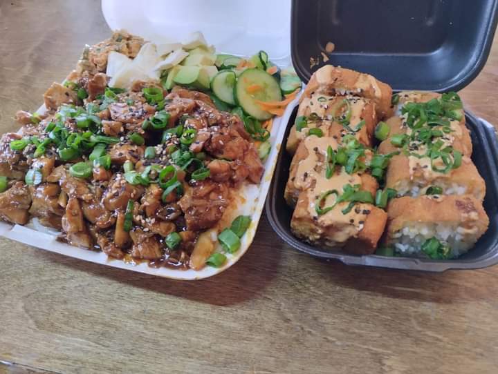 Pollo teriyaki sobre una cama de arroz blanco, ensalada de surimi, ensalada de surimi, aguacate y queso crema, Cebollin y ajonjolí