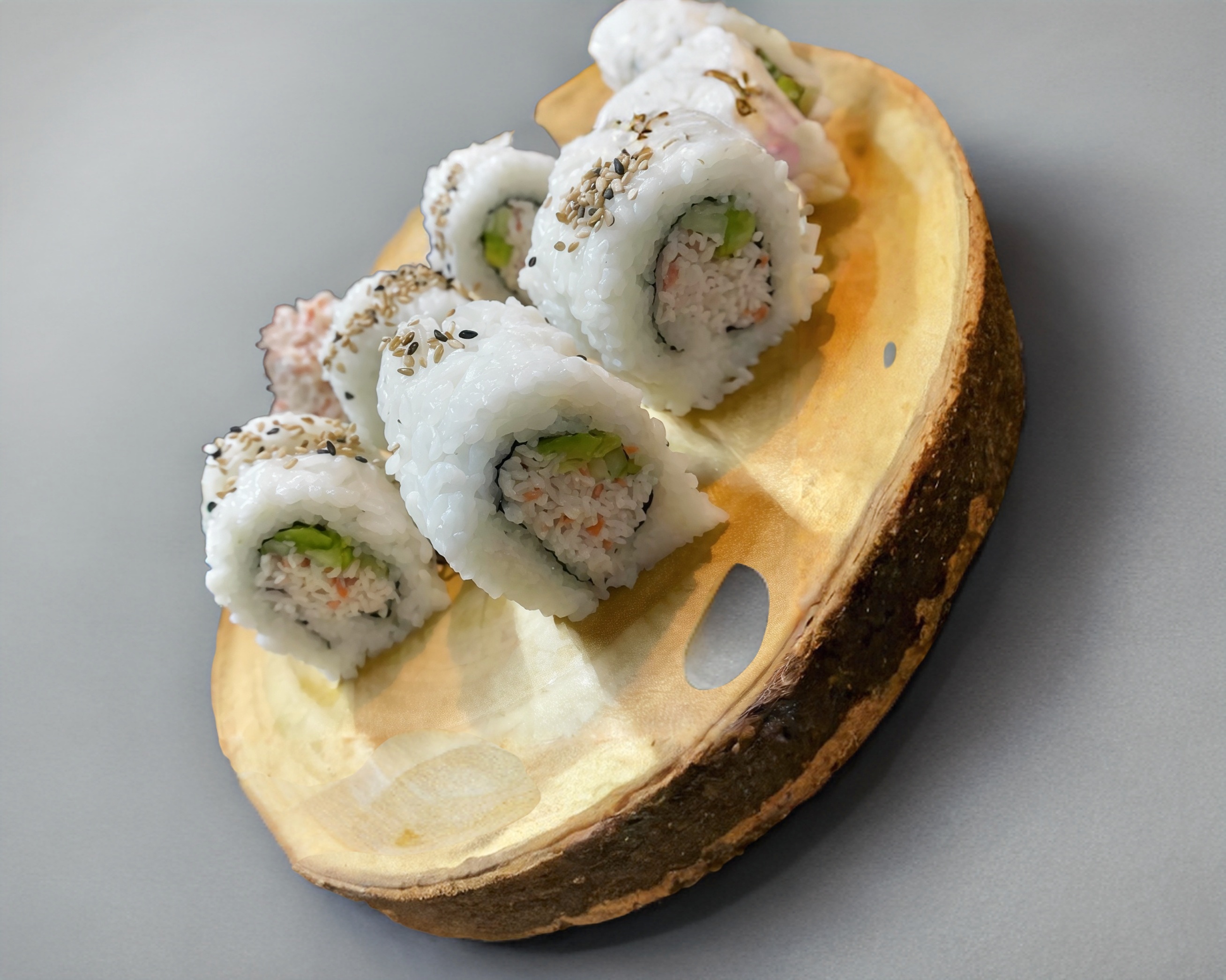 Cangrejo, queso, aguacate, callo, cangrejo, spicy y limón amarillo encima.