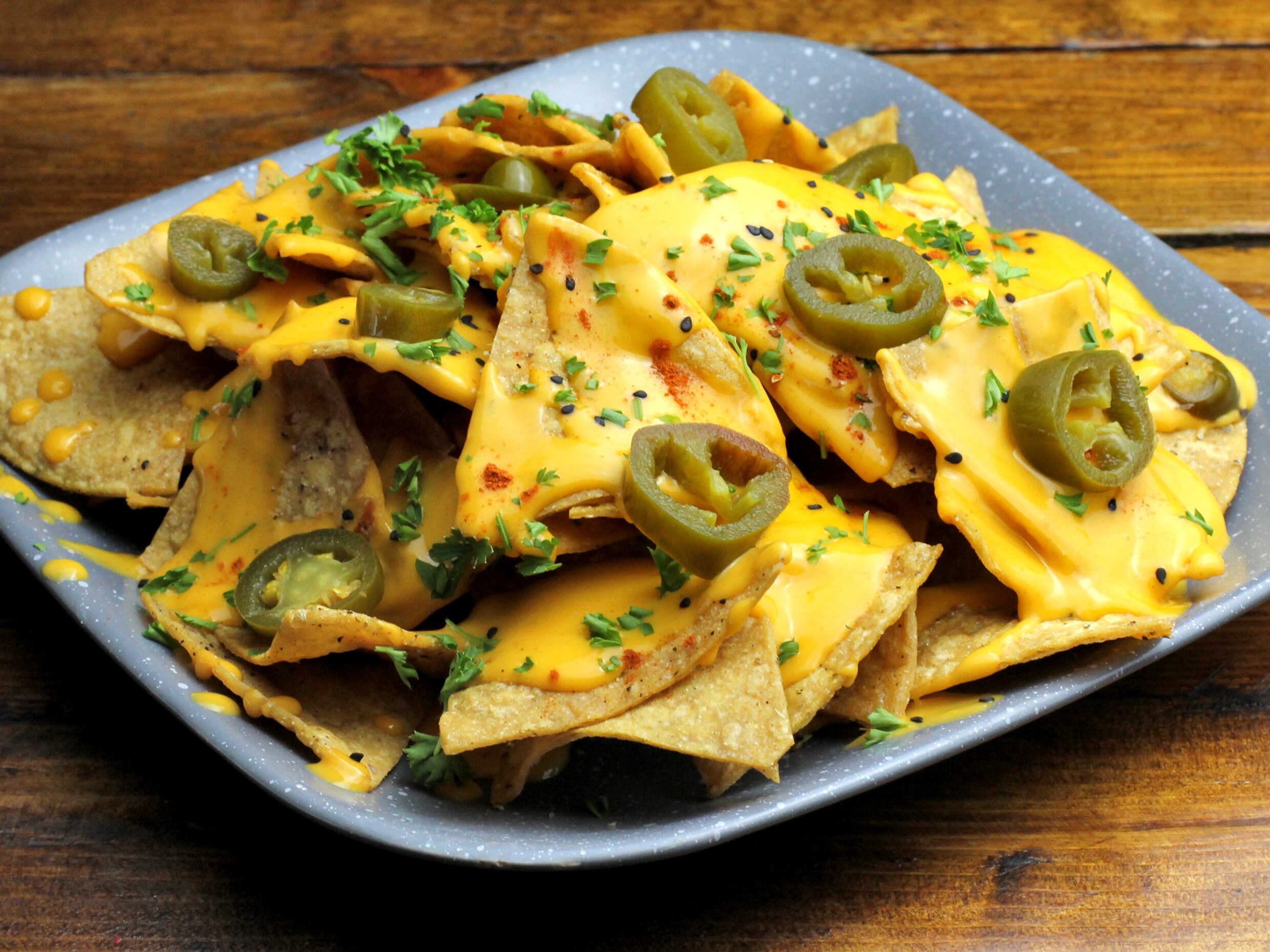 Servido con salsa de queso cheddar y chiles jalapeños encurtidos.