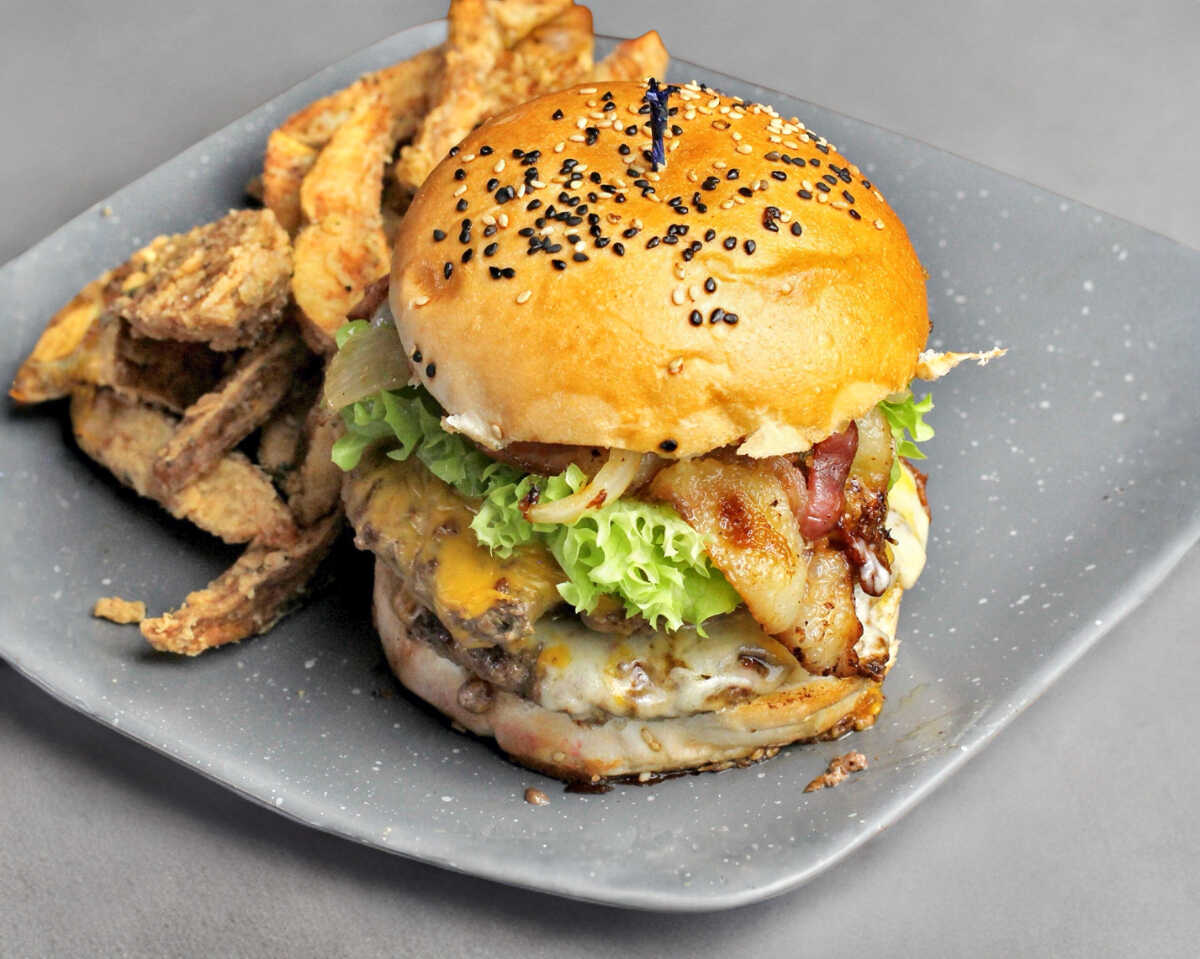 Doble porción de carne, queso americano y monterrey, cebolla carmelizada, mayo, lechuga y tomate.