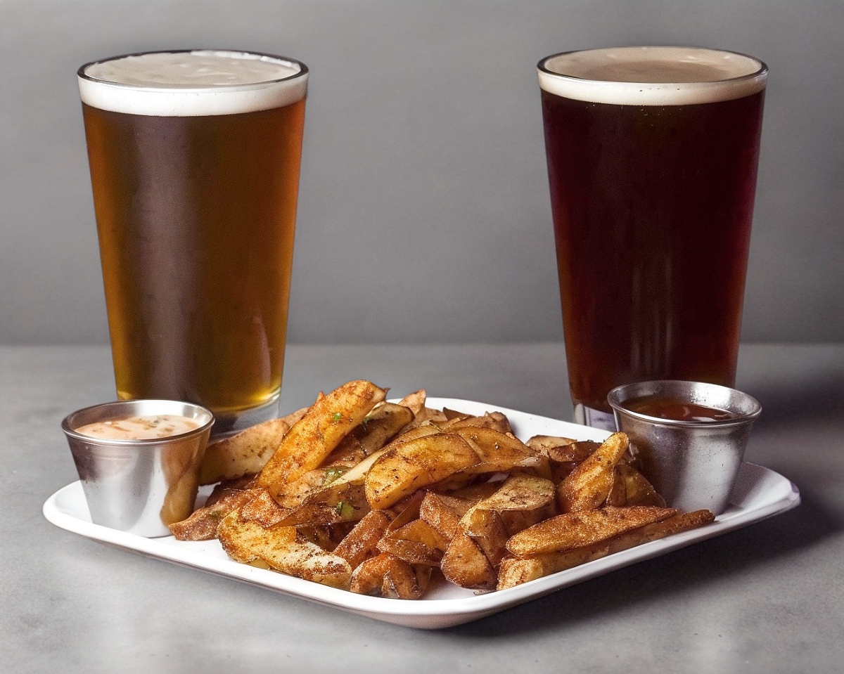 Gajos de papa espolvoreadas con hierbas y servidas con dúo de aderezos.