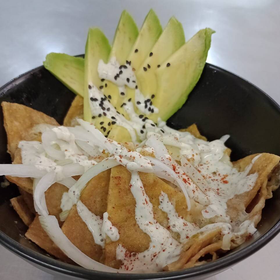 Chilaquiles en salsa verde acompañados de aguacate, cebolla blanca y crema.