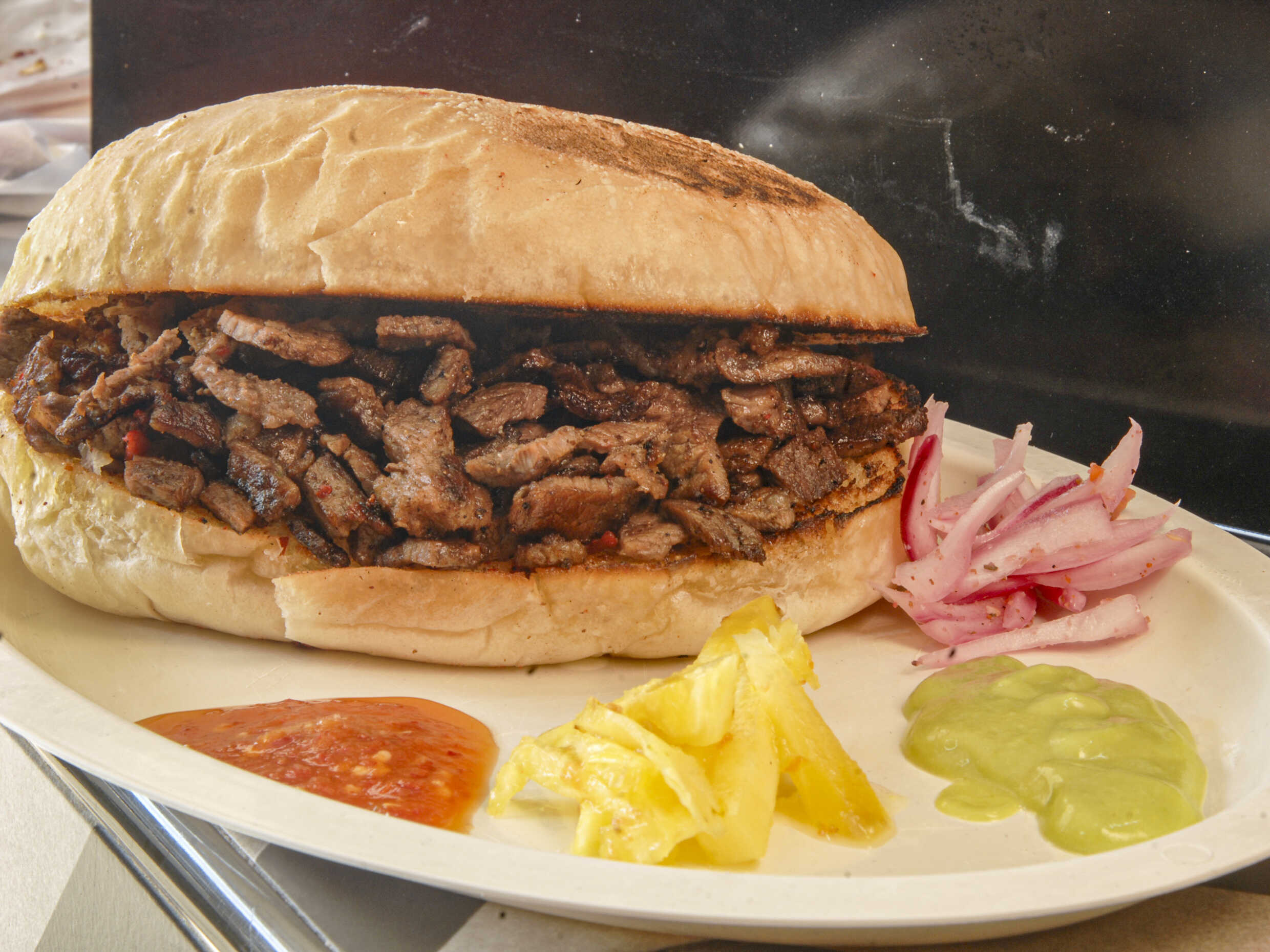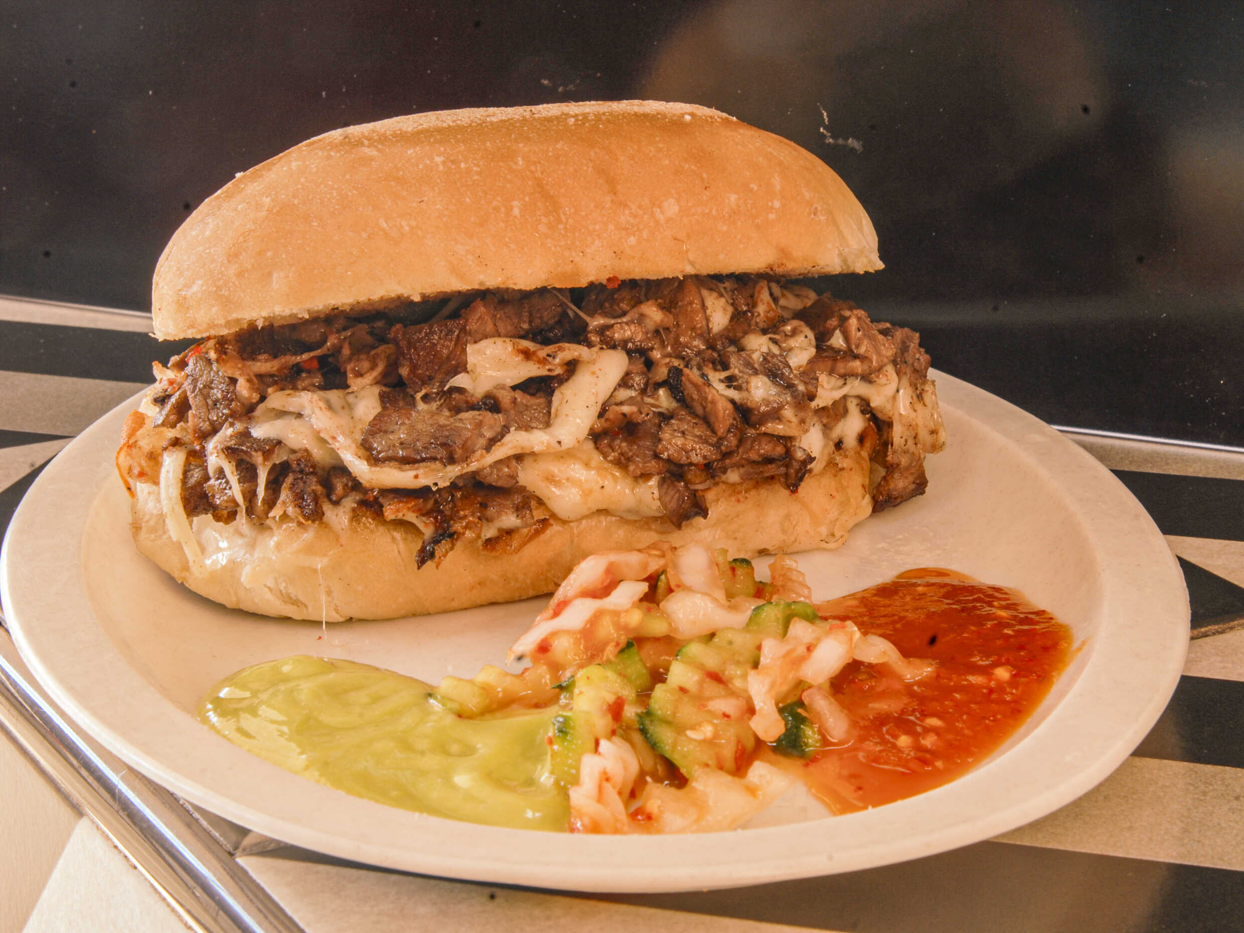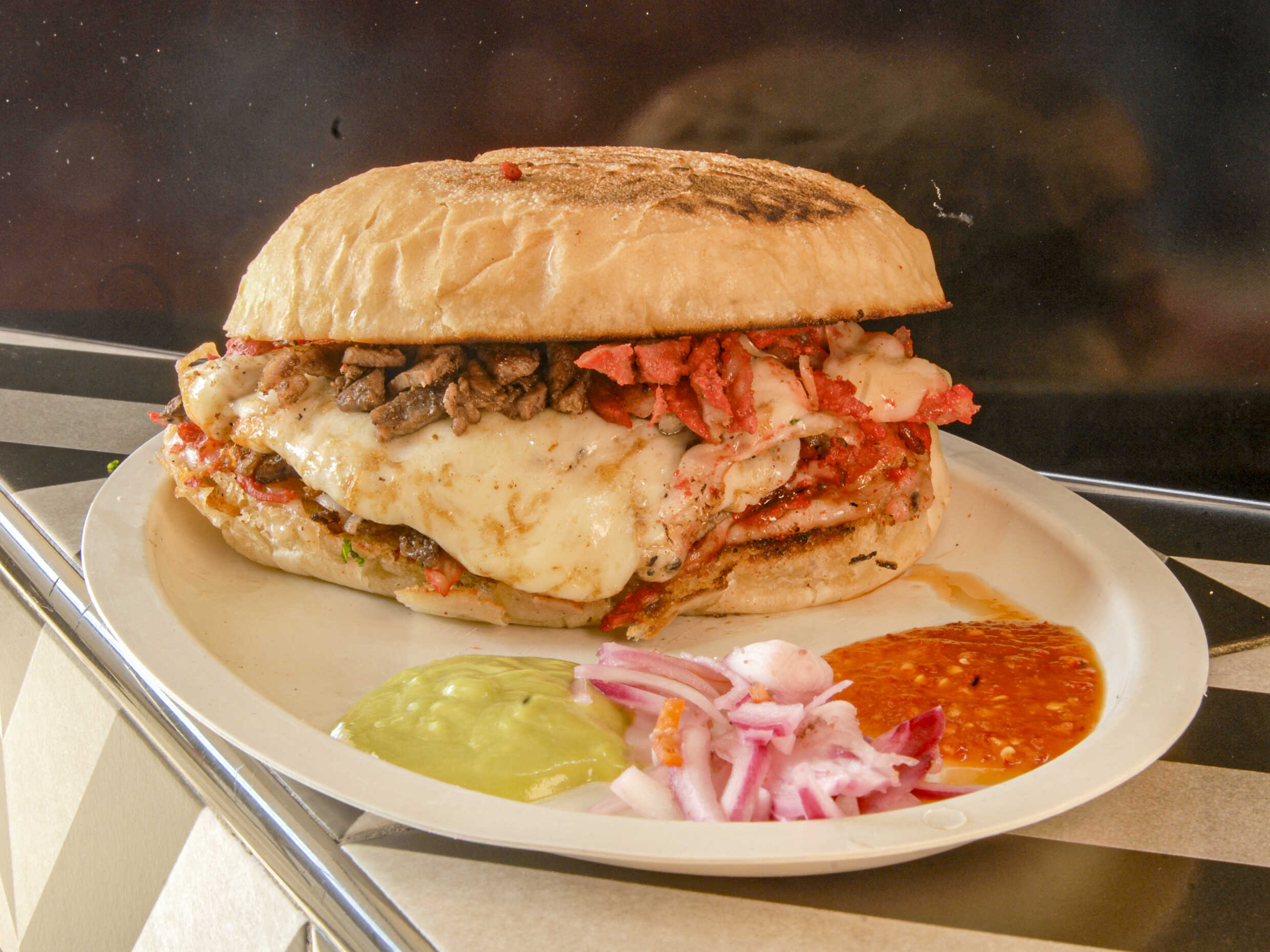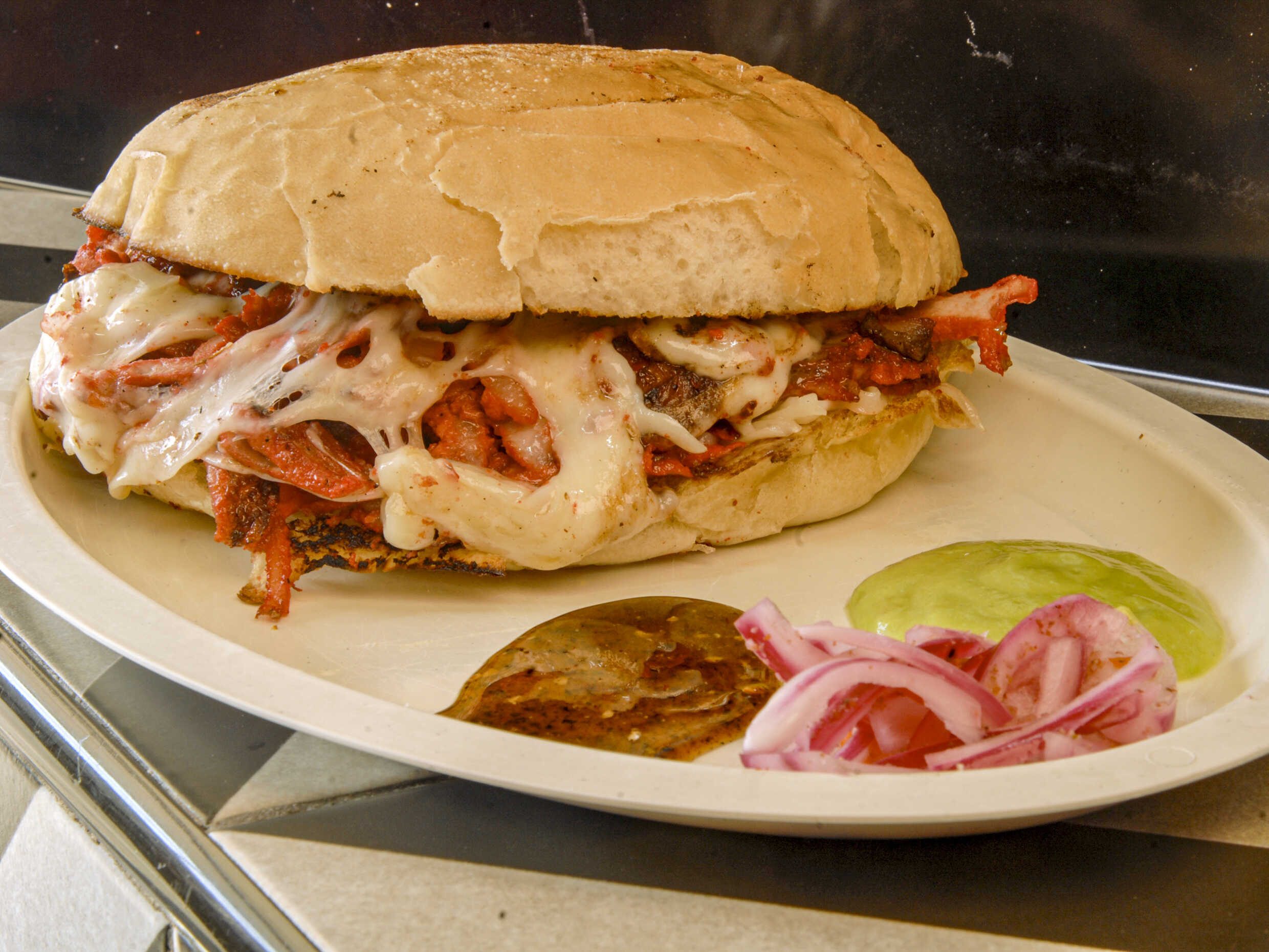Pan telera, queso, carne asada y carne adobada