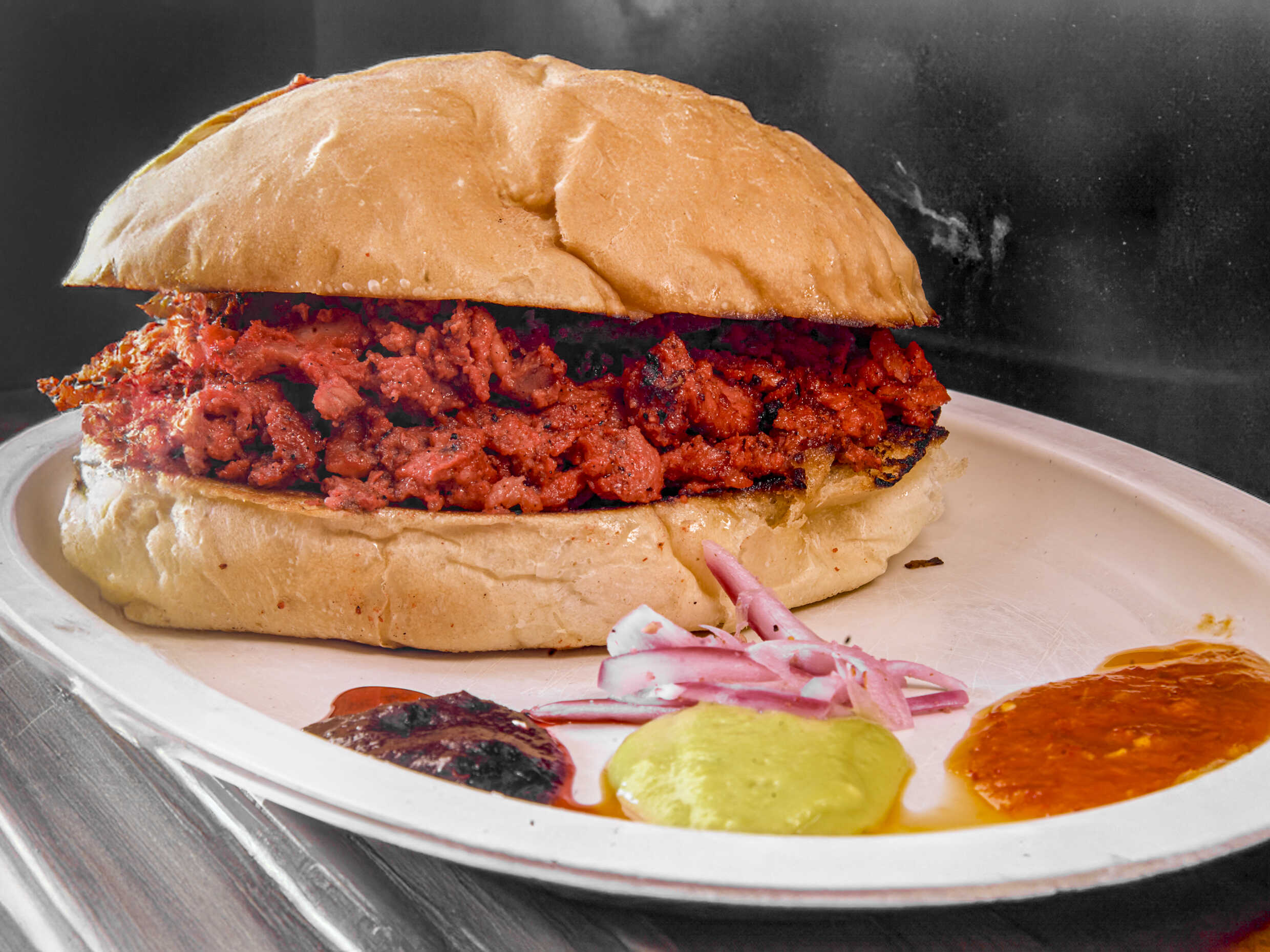 Pan telera, mayonesa, carne adobada de cerde