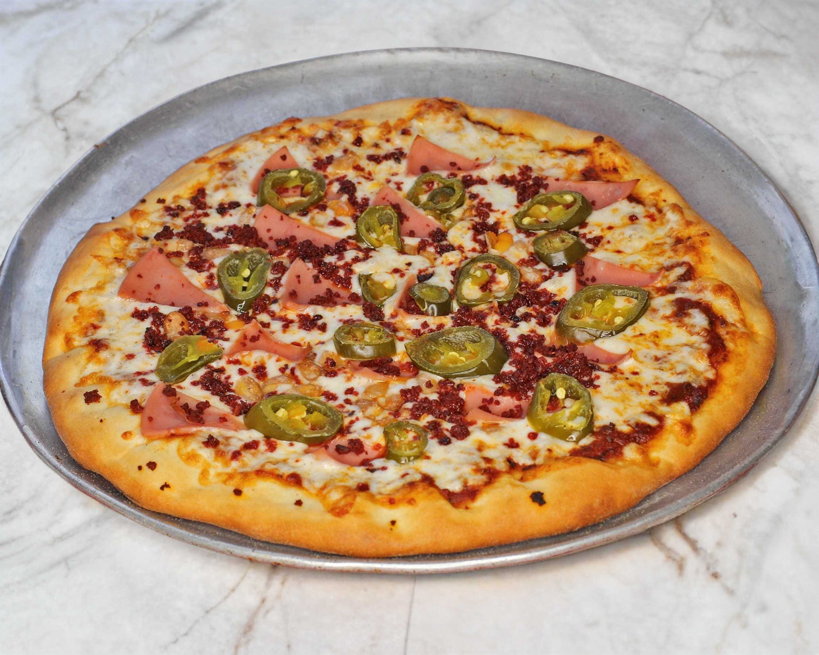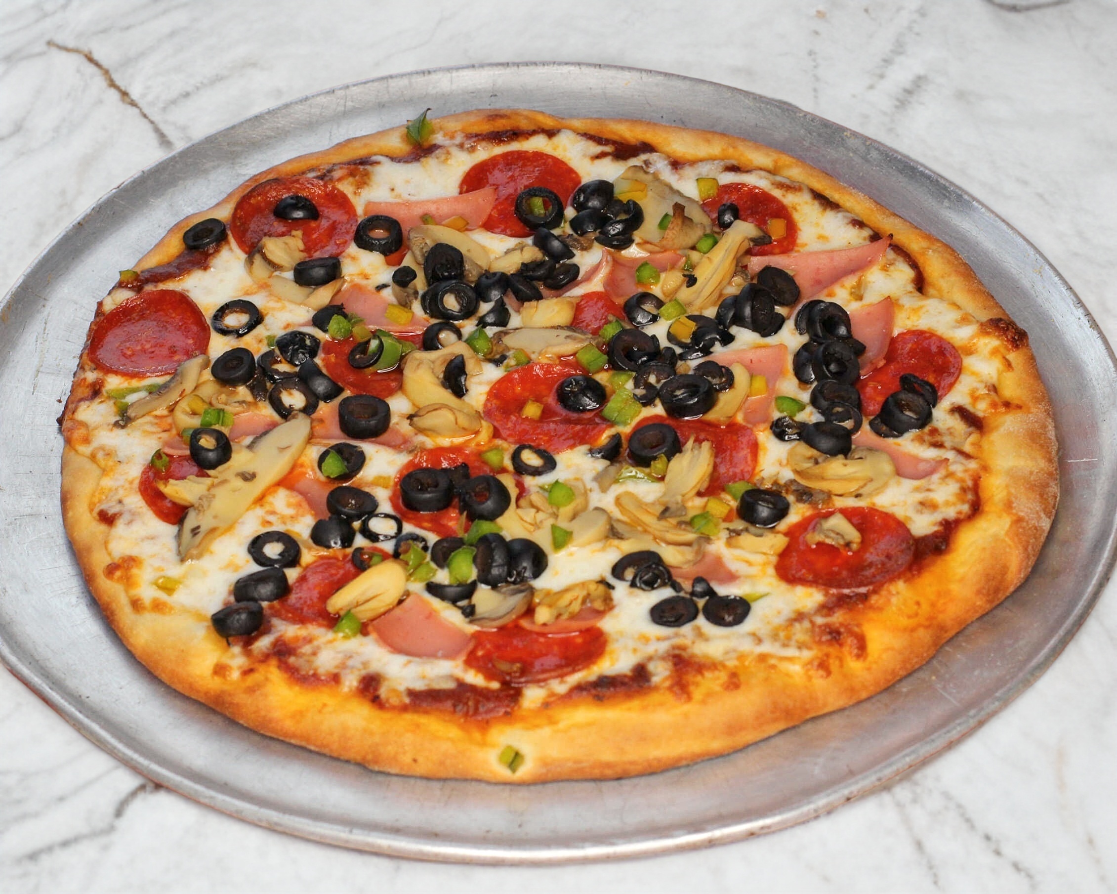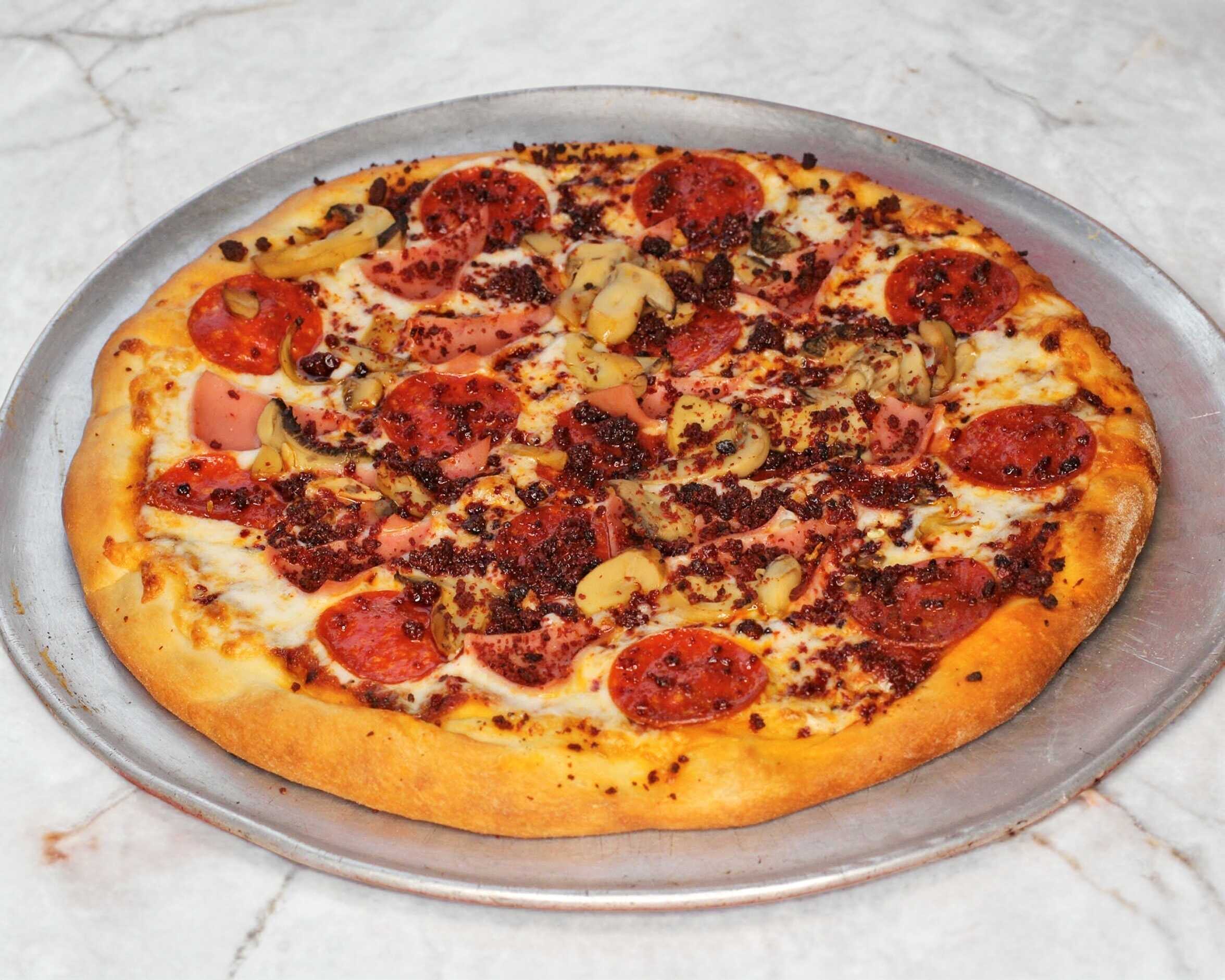 Pepperoni, jamón, hongos, aceitunas negras y chile morrón.