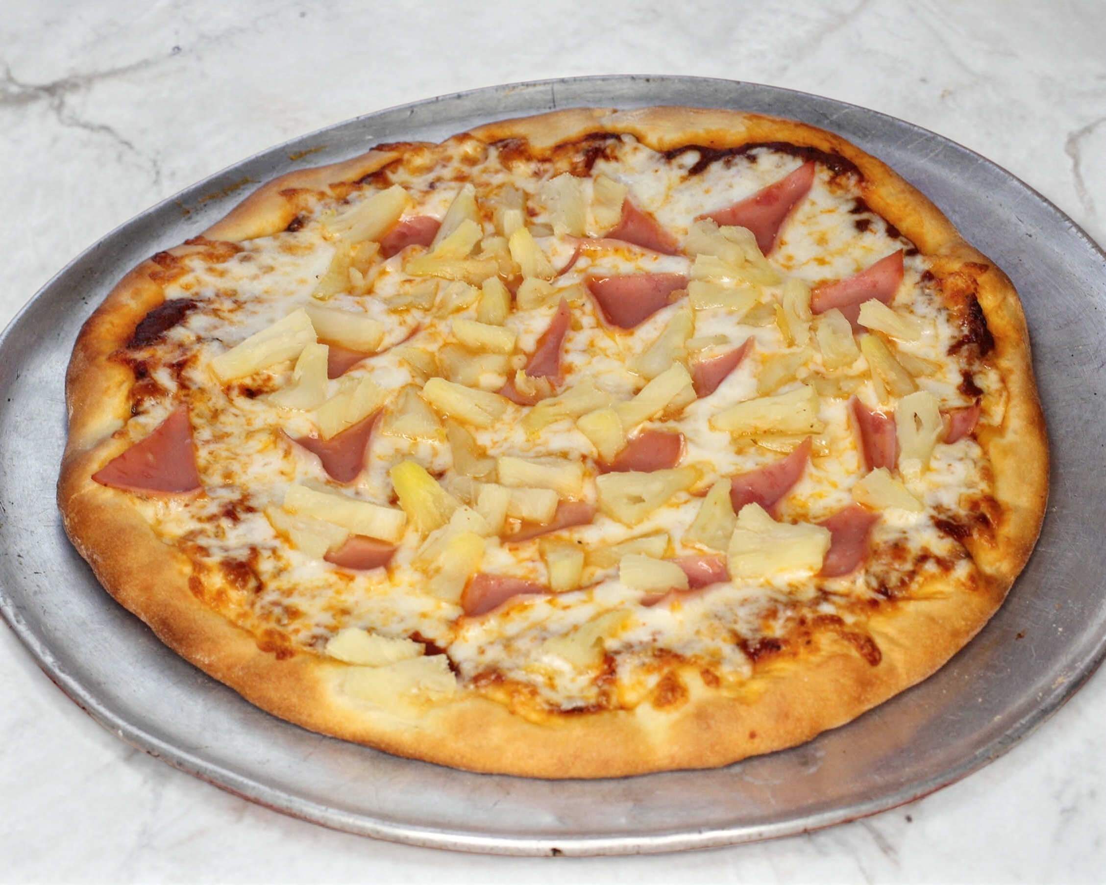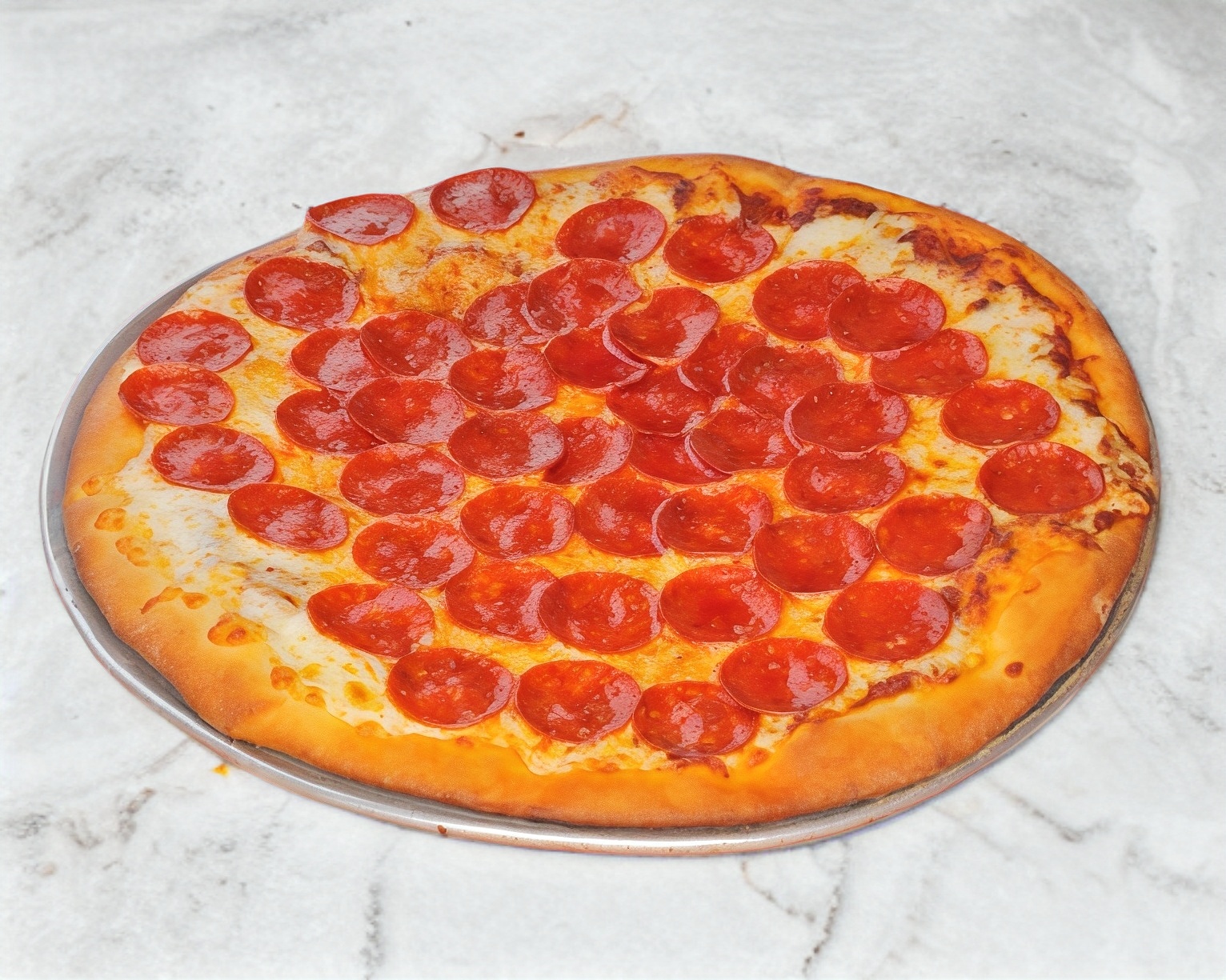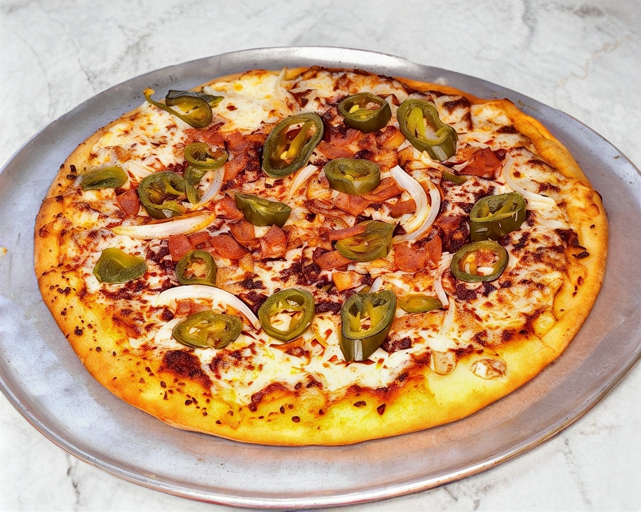 Pepperoni, jamón, hongos, aceitunas negras y chile morrón.
