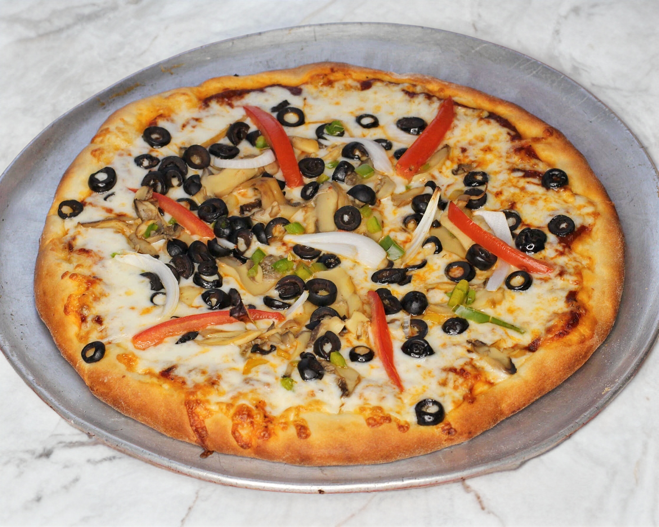 Hongos, aceitunas, tomate, cebolla y chile morrón.