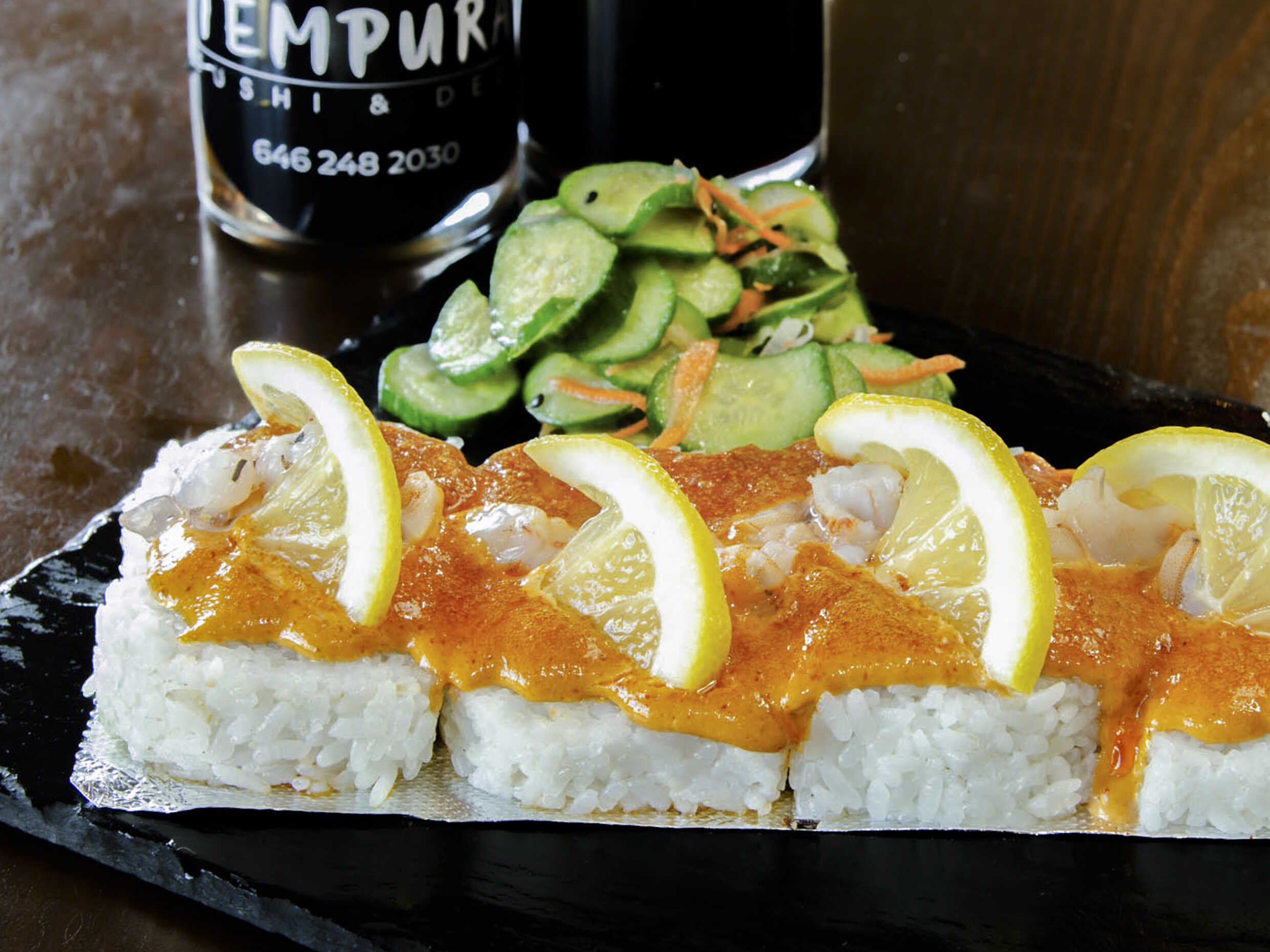 Queso, aguacate y cangrejo por dentro. Bañado con masago spicy. Trozos de camarón encima y laminas de limón amarillo.