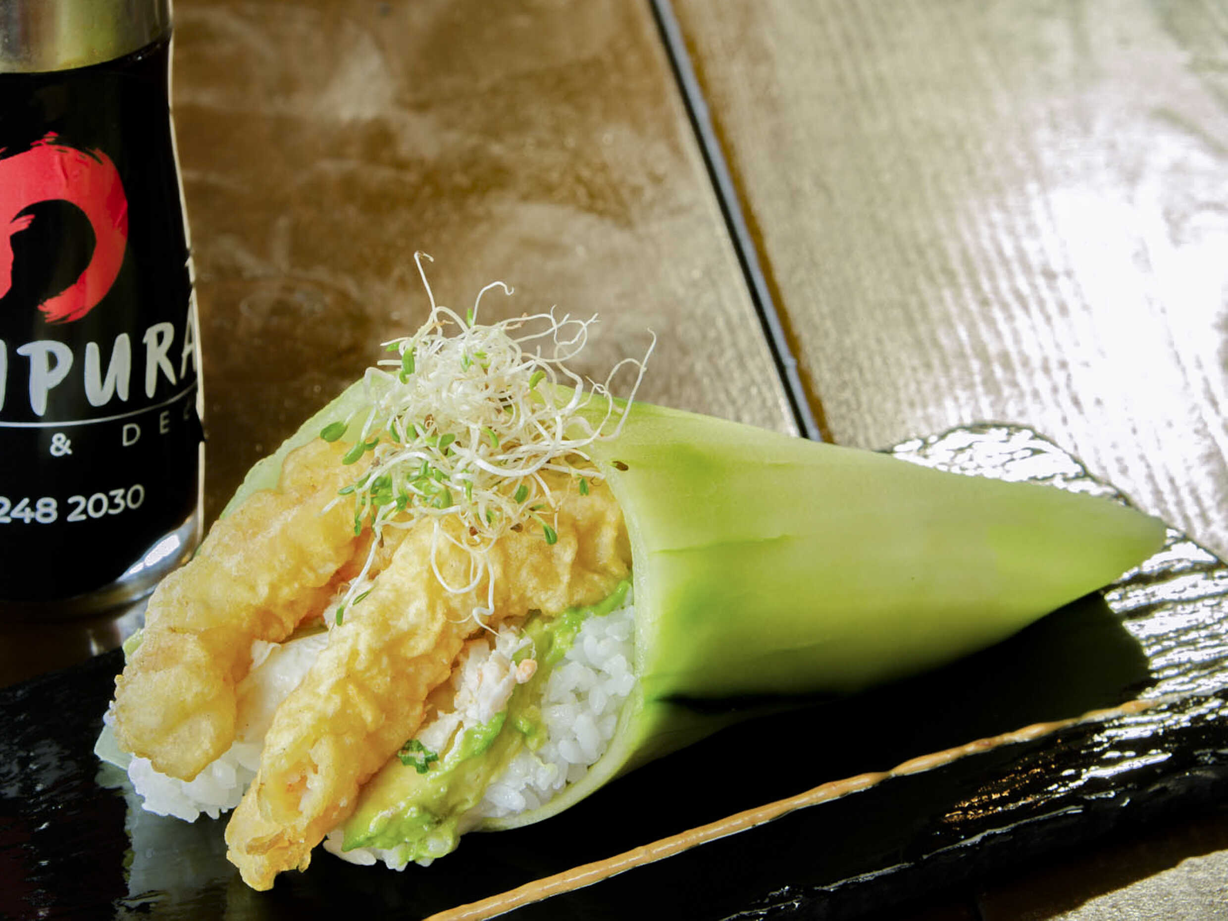 Burritos de sushi forrados en alga, lechugas mixtas, vegetales, queso y aguacate. Camarones tempura o enchilosos, acompañado de tampico.