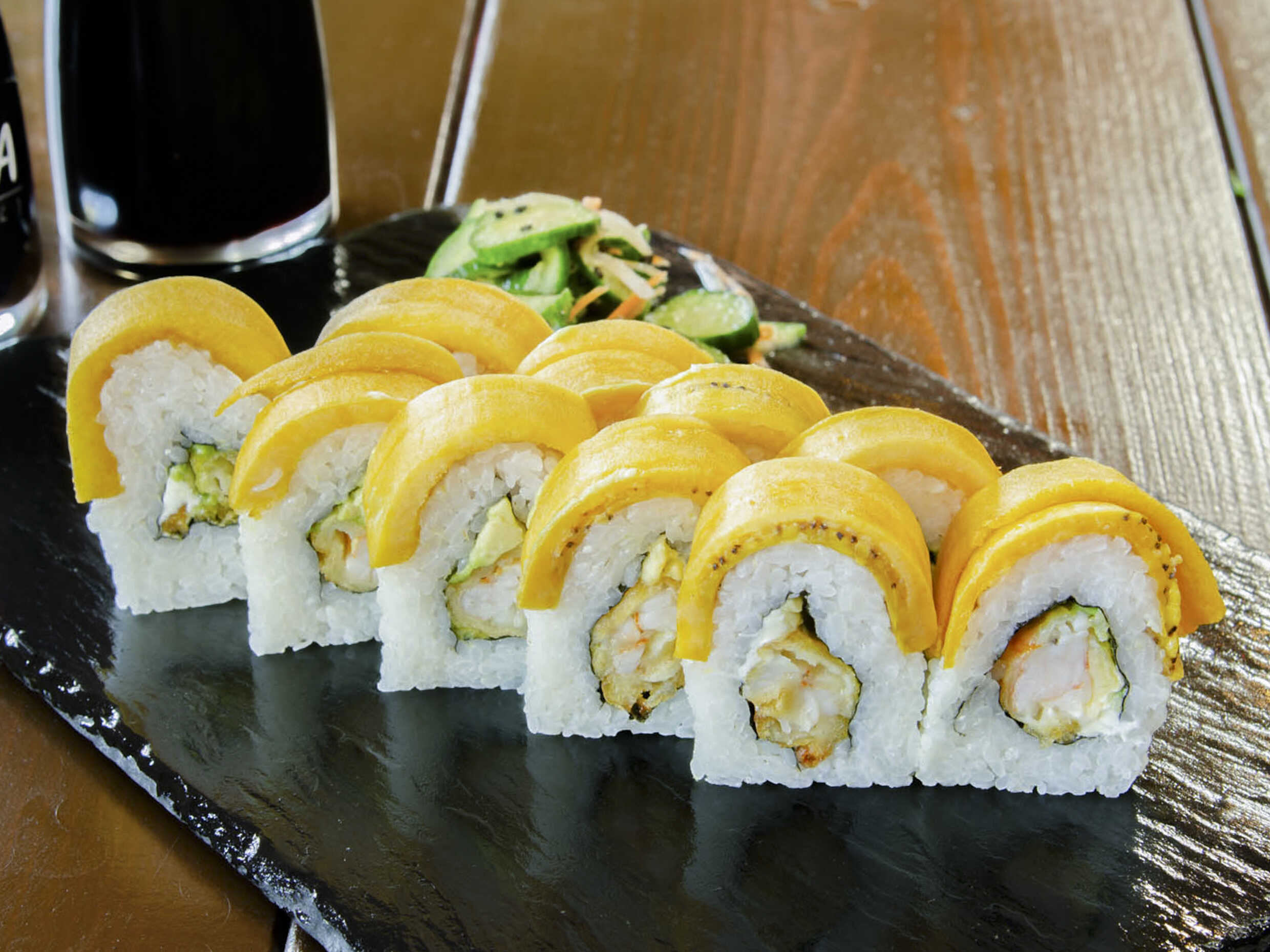 Queso, aguacate, pepino, atún y mango. Forrado en alga.