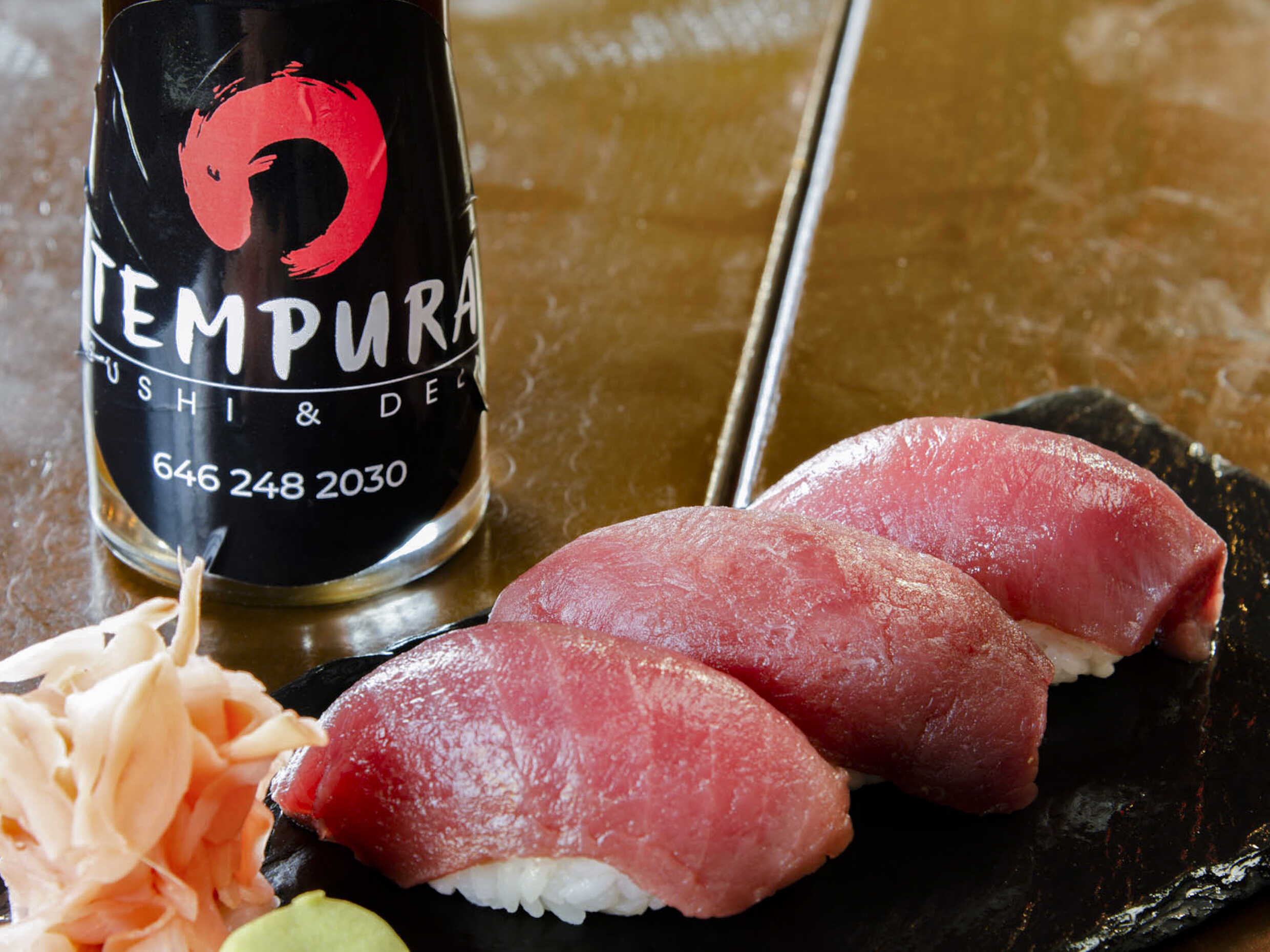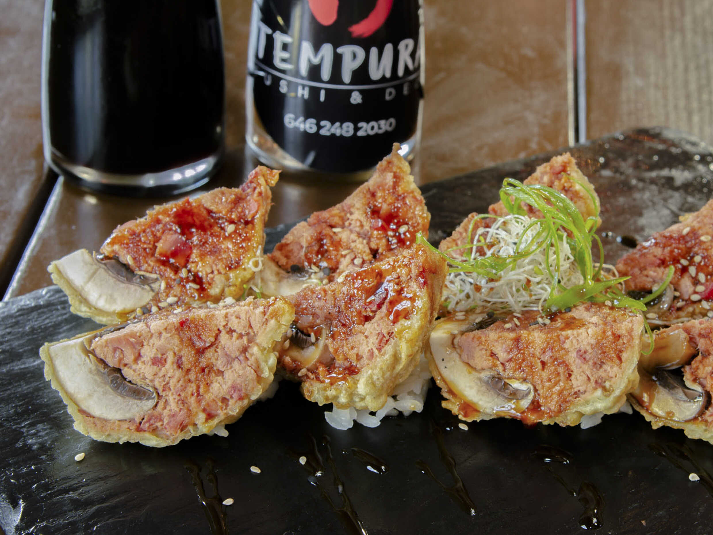 Queso, aguacate y camarón capeado por dentro. Forrado en atún sellado, bañado en masago spicy.