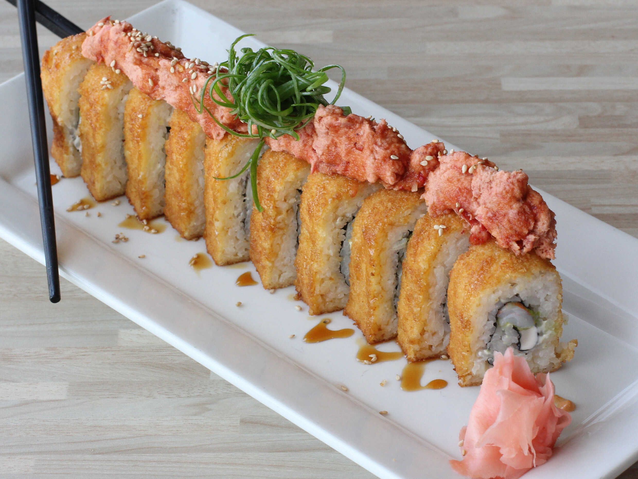 Queso, aguacate y kanikama por dentro. Forrado en camarón. Encima un topping de spicy de salmón empanizado.