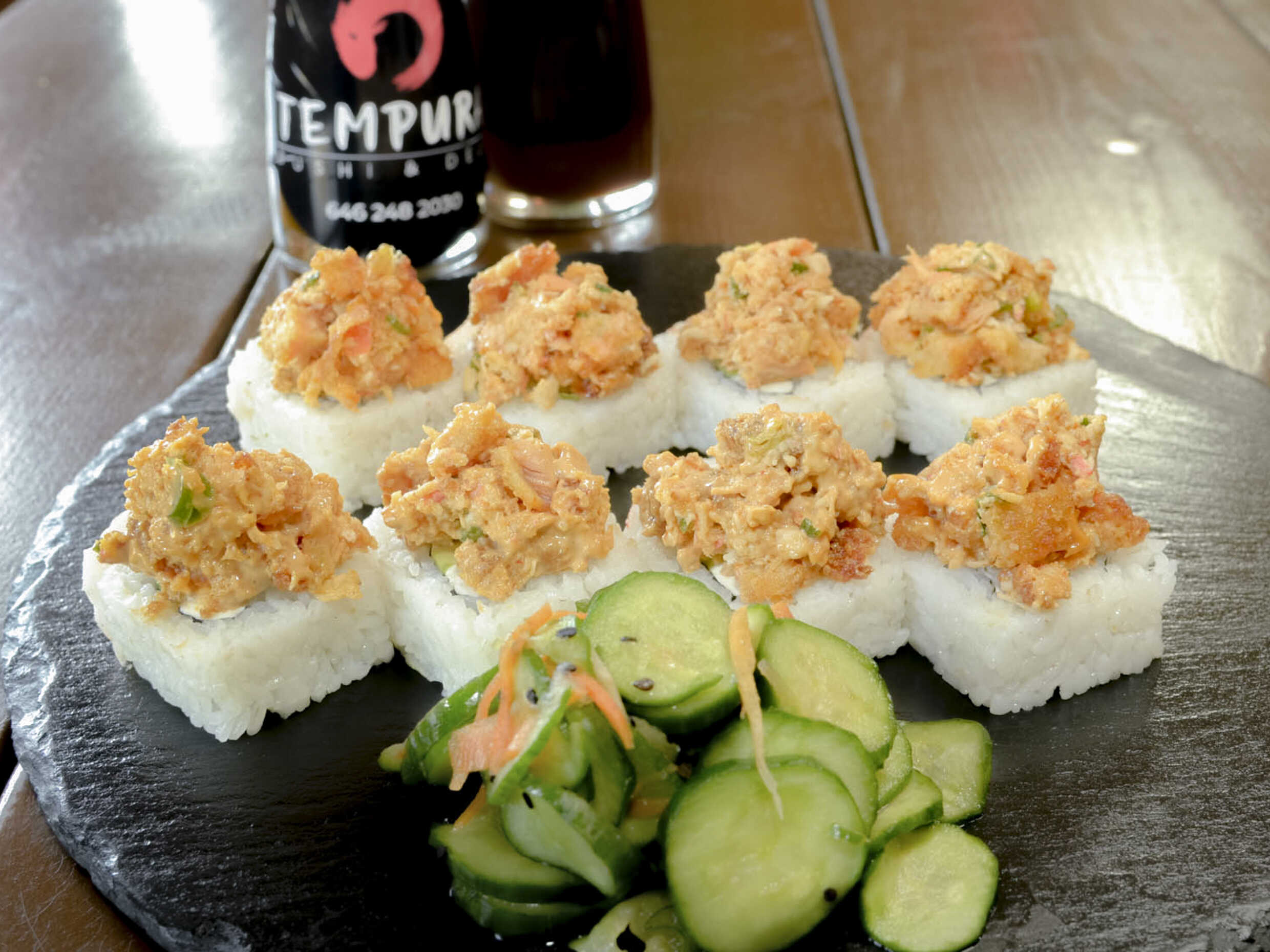 Queso, aguacate y cangrejo por dentro. Encima un spicy de tampico con chipotle.