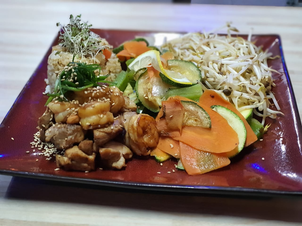 Verduras sazonadas a la plancha, con chop-suey y arroz yakimeshi.