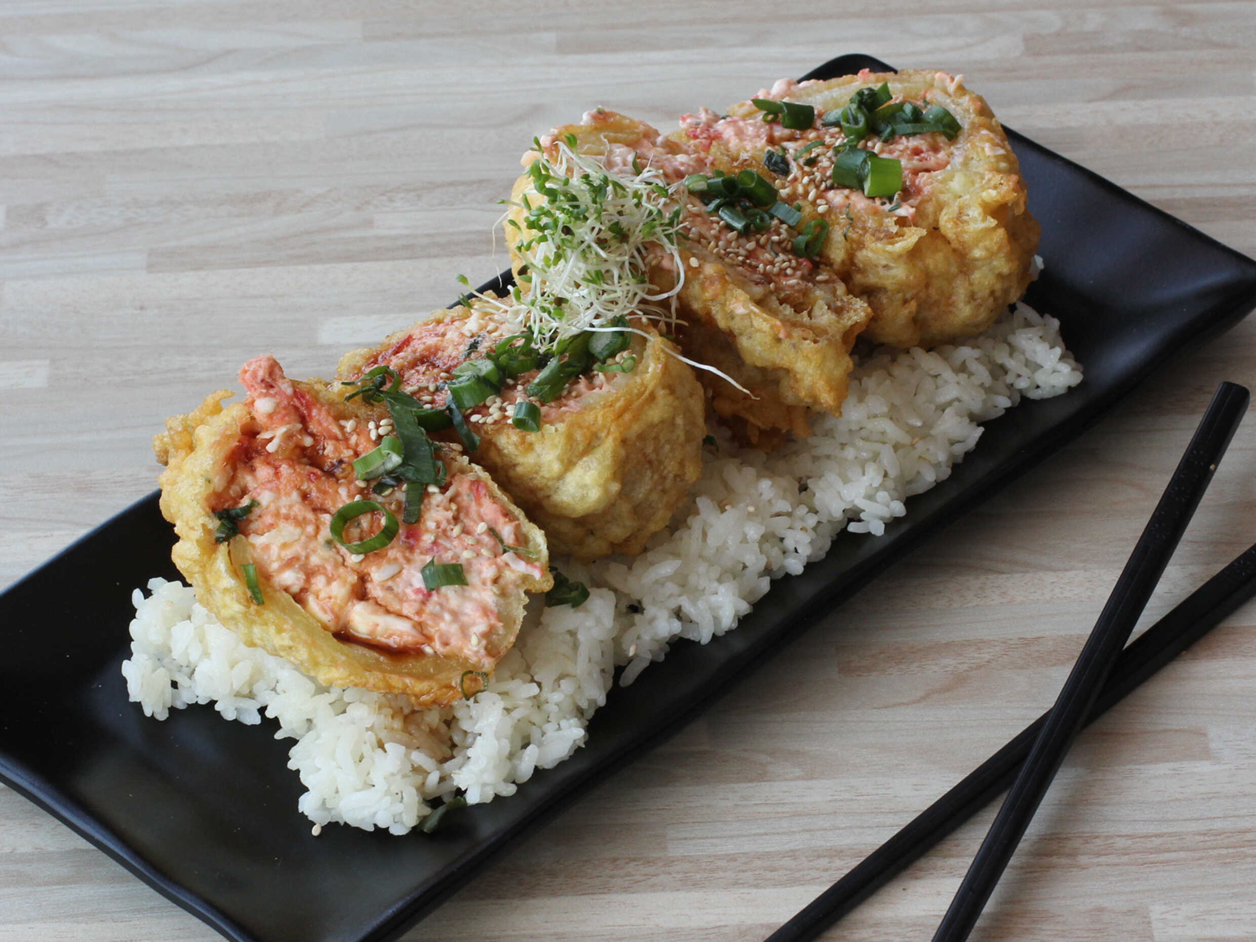 Arroz frito con aguacate, queso Philadelphia, Tampico, salsa dulce y ajonjolí. Con un top de camarones capeados.