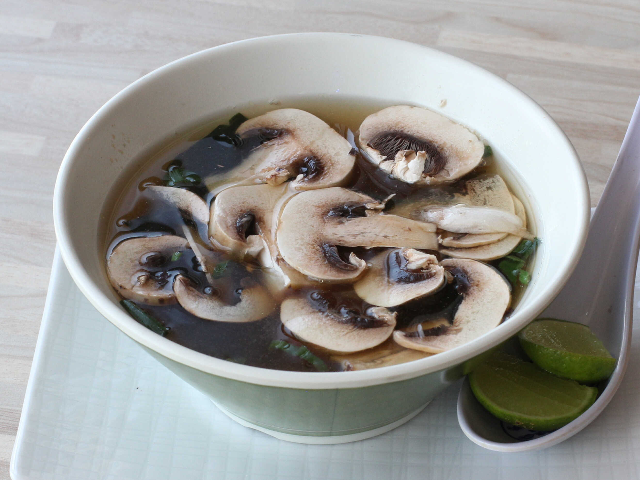 Sopa de pasta miso, acompañada de tofu, wakame, cebollín y champiñón.
