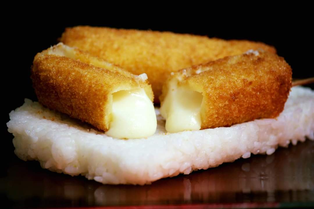 3pz. Brochetas empanizadas, servidas en una cama de arroz.