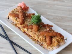 Queso, aguacate y camarón por dentro. Forrado en salmón. Gratinado en queso Monterrey. Topping de marlín ahumado