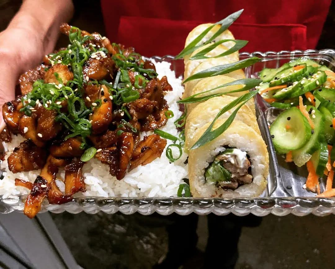 Tazón con arroz al vapor, acompañado de vegetales salteados y proteína bañada en salsa teriyaki.