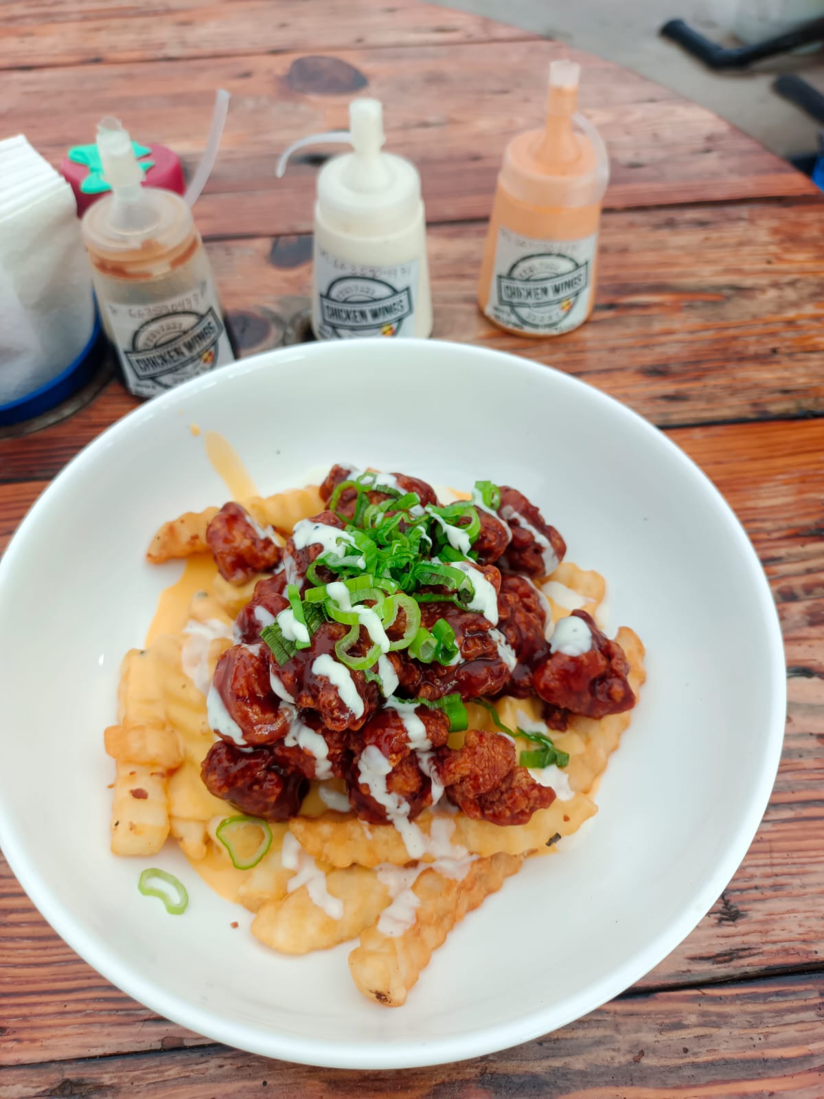 300 g De papas a la francesa, queso cheddar, 6 piezas de alitas en salsa de su elección.