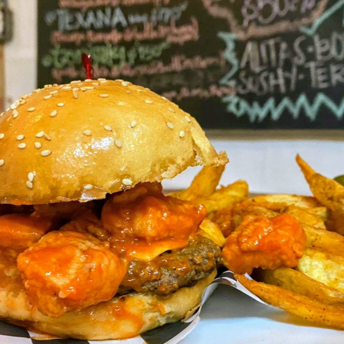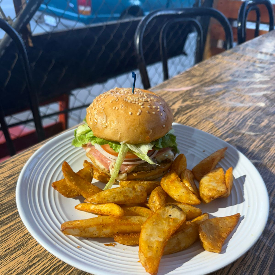 Carne 100% natural,BBQ,tocino queso tomate lechuga acompañada de papas sazonadas