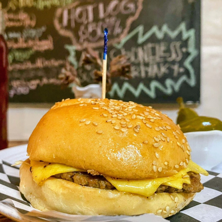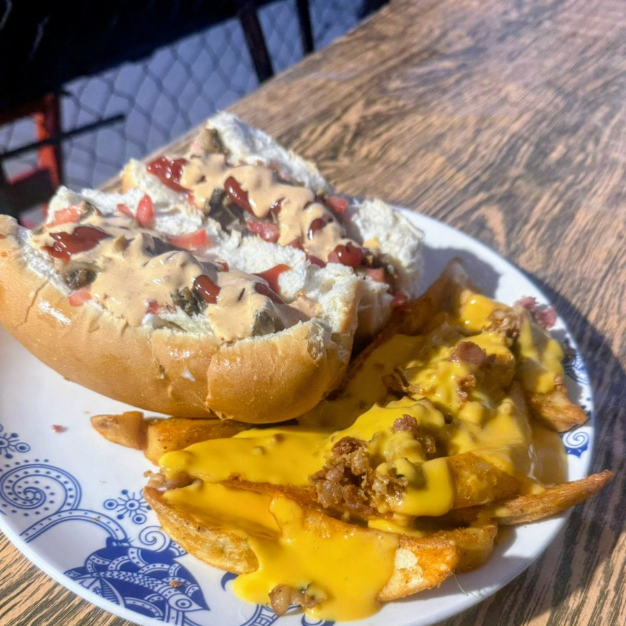 Carne 100%natural ,queso cebolla tomate lechuga mayonesa ketchup y mostaza
