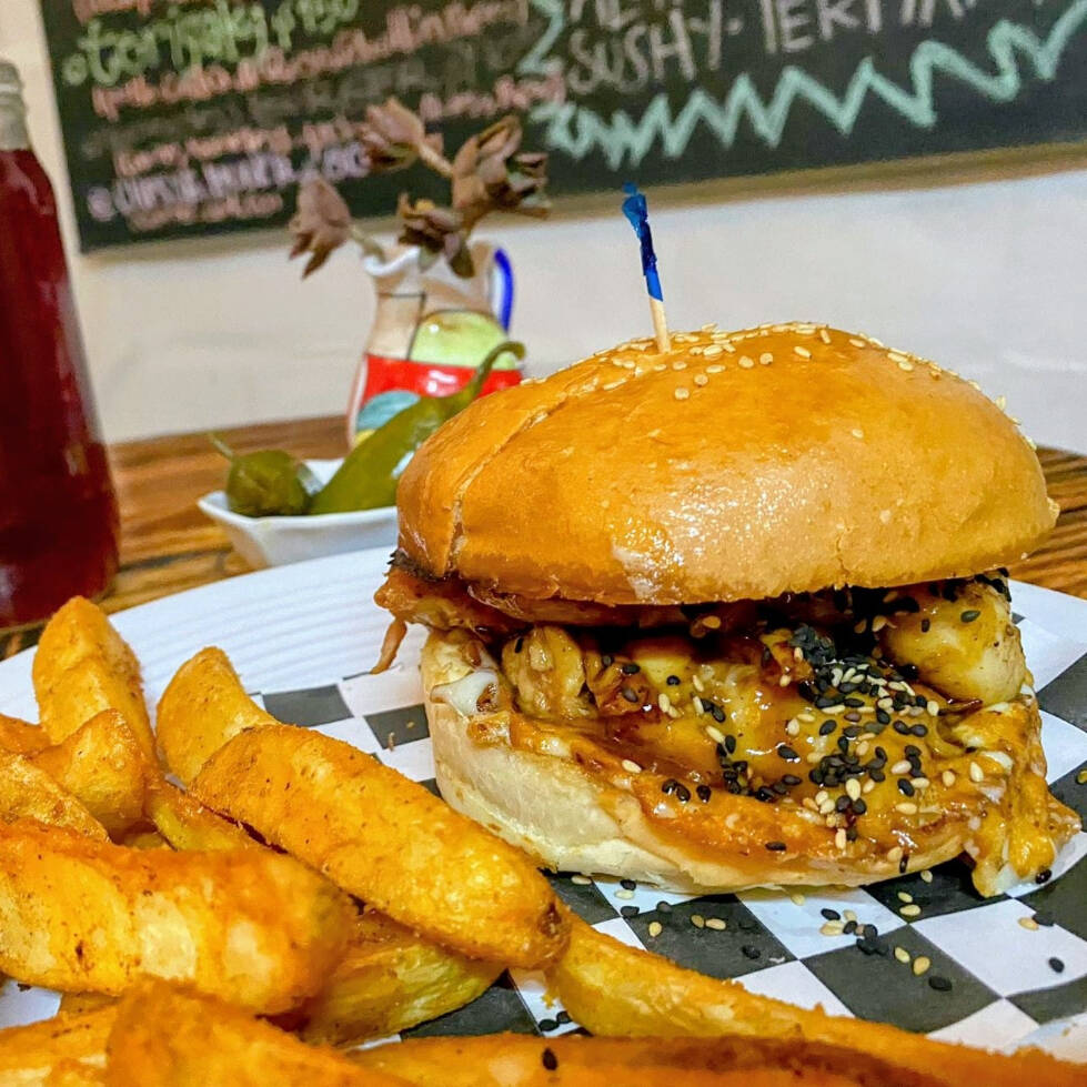 Pollo teriyaky costra de queso cebollin y ajonjolí acompañada e papas sazonadas