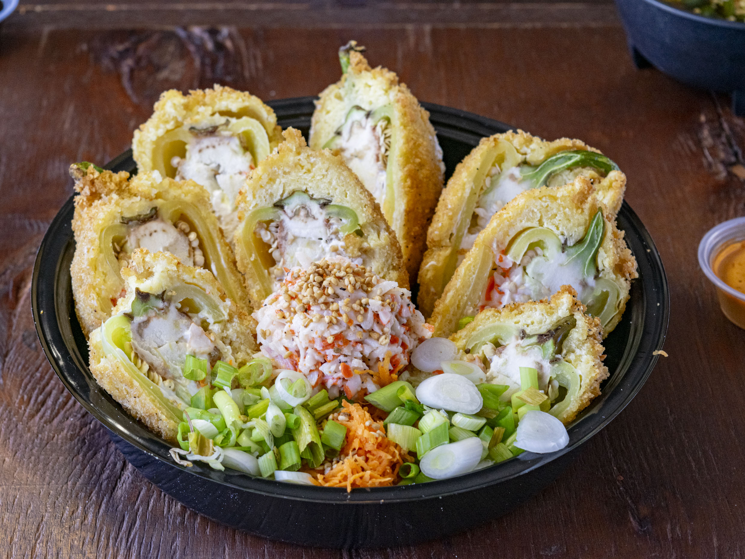 Rollo empanizado preparado con carne, pollo, camarón, queso philadelphia y aguacate. Acompañado de aderezo chipotle y salsa anguila.