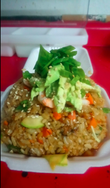 Arroz frito con pollo, o camarón, calabaza, jalapeño, cebollín, zanahoria y hongo. Acompañado con aguacate.