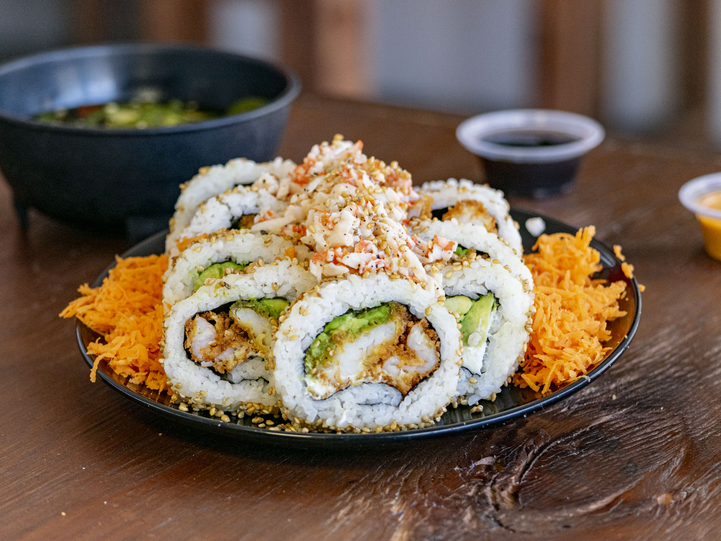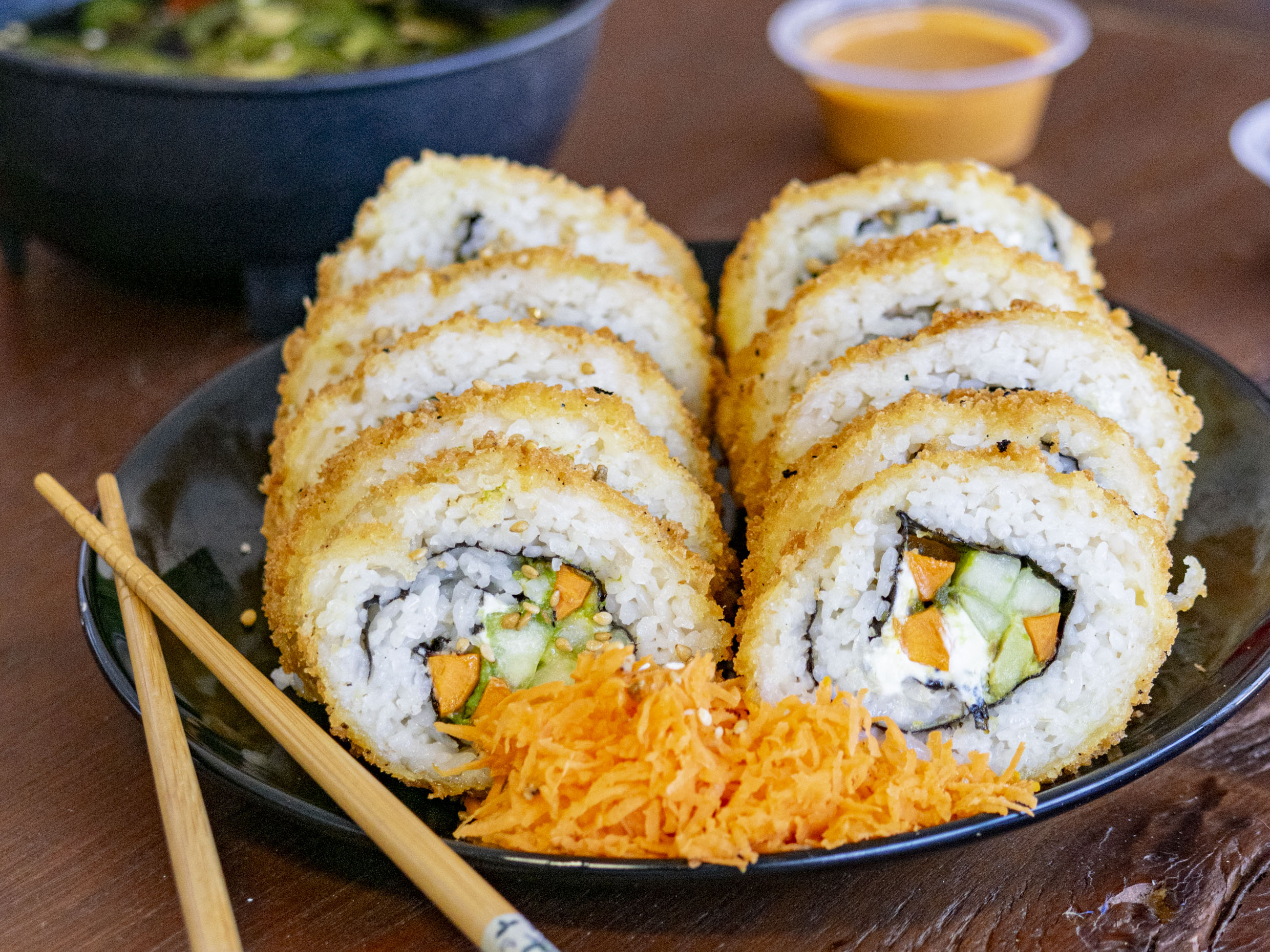 1 Rollo de sushi de 10 bocados PD: Res, queso crema, aguacate, chile dedito PF: empanizado acompañado de ensalada Tampico.