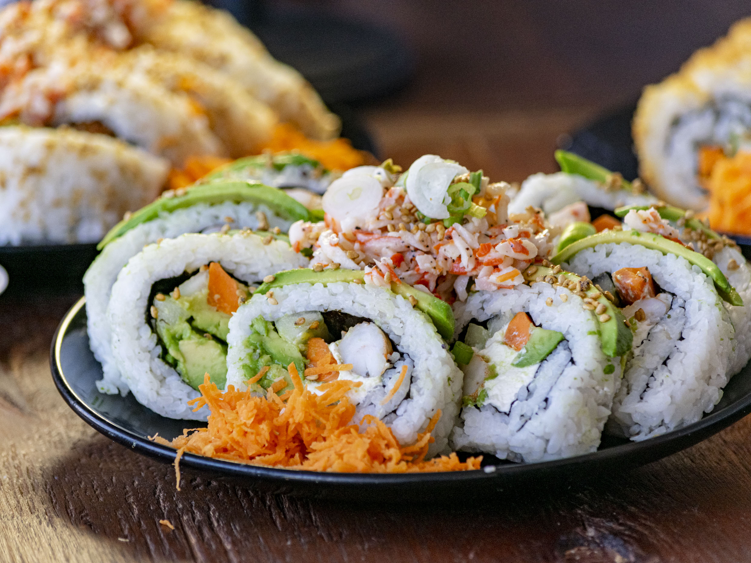 Rollo preparado con queso crema, aguacate, Camarones tempura. PF: Arroz salteado en ajonjolí enmielado.