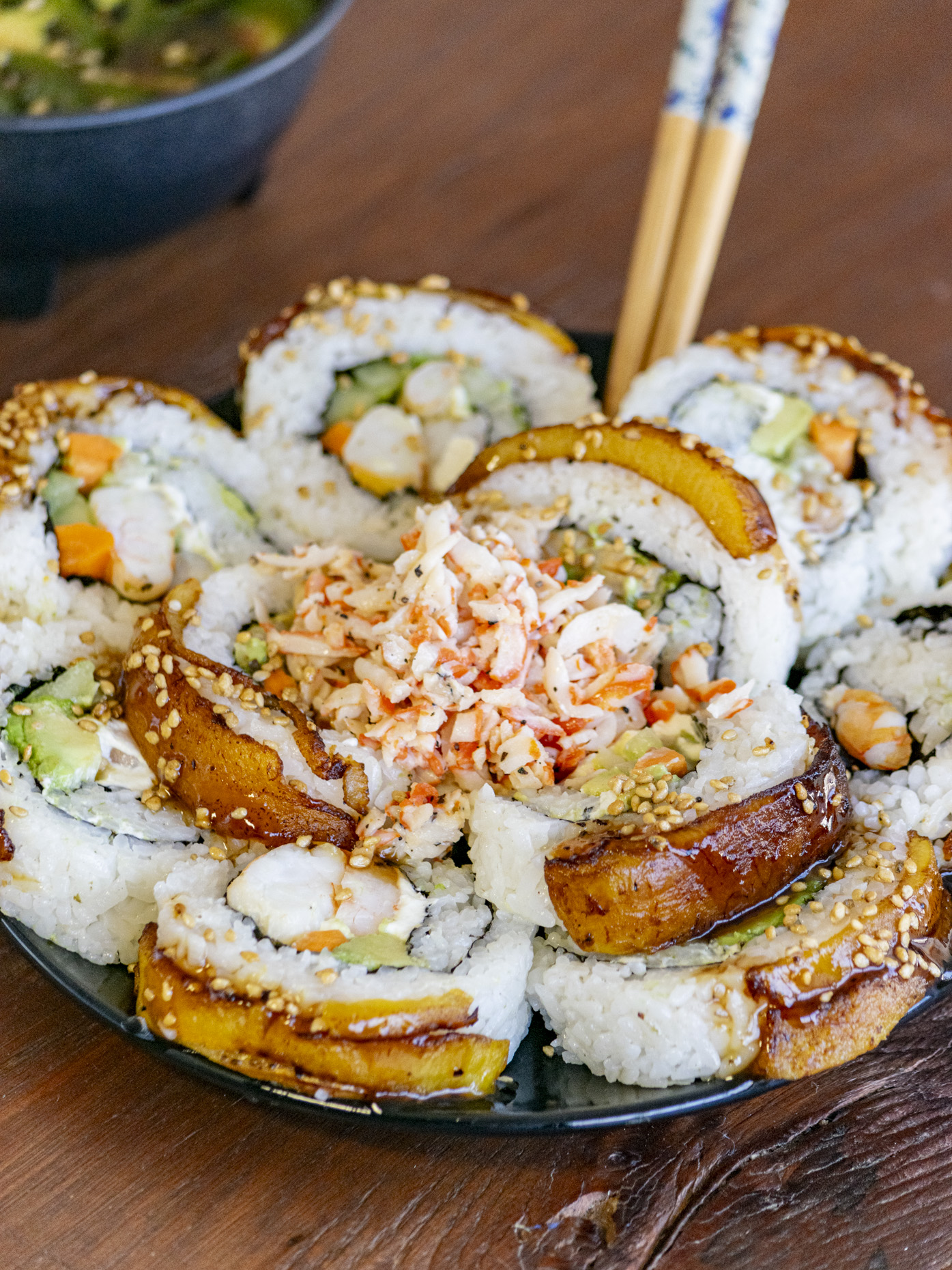 Rollo preparado con zanahoria, queso crema, aguacate. PF: laminas de plátano macho bañado en salsa anguila.