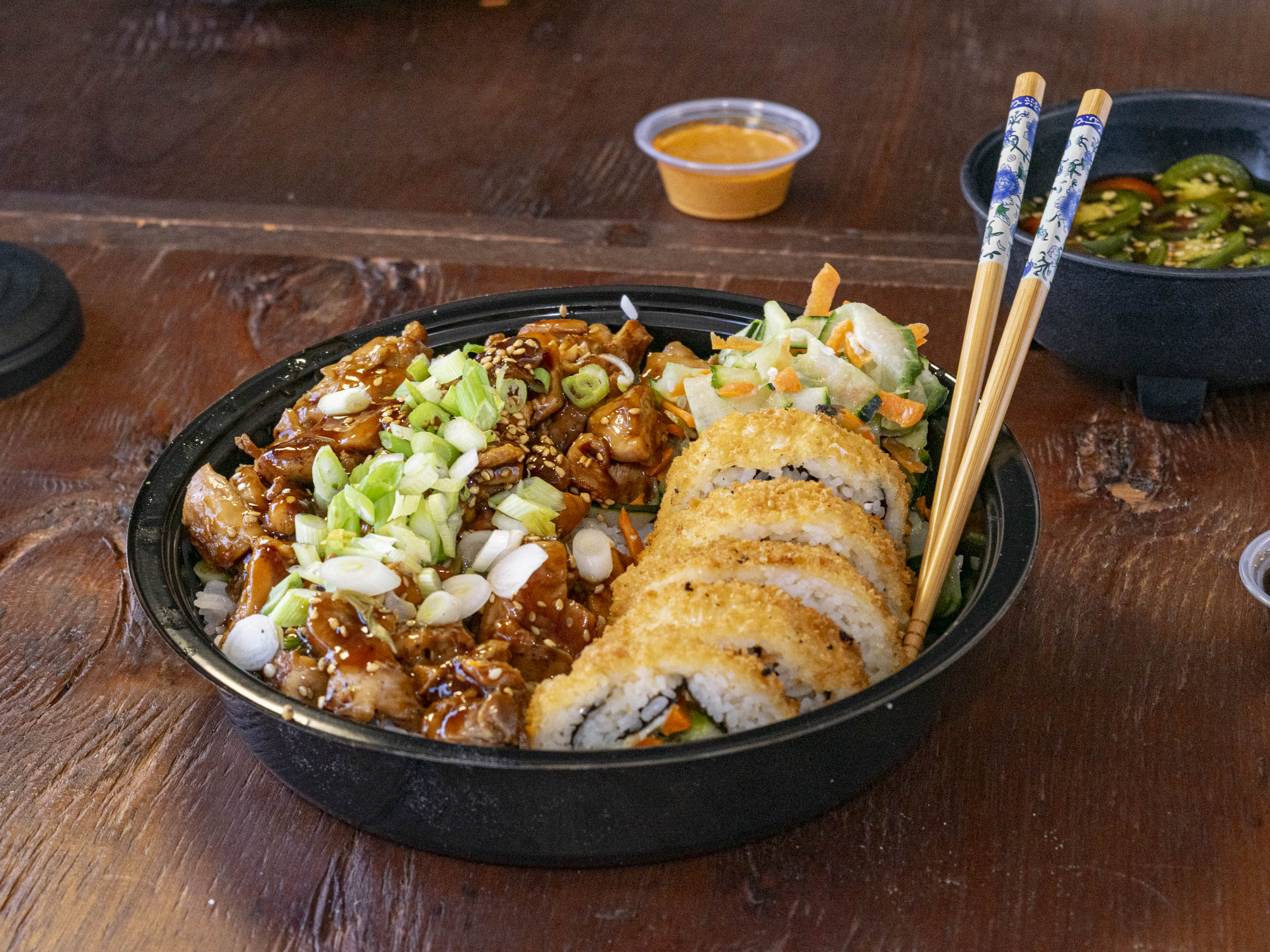 Cama de arroz, 1 porción de ensalada de la casa, 1 porción de queso crema, 1 porción de aguacate, 1 porción de ensalada de surimi. Pollo a la plancha con Tare y un aderezo chipotle. Cebollín y ajonjoli