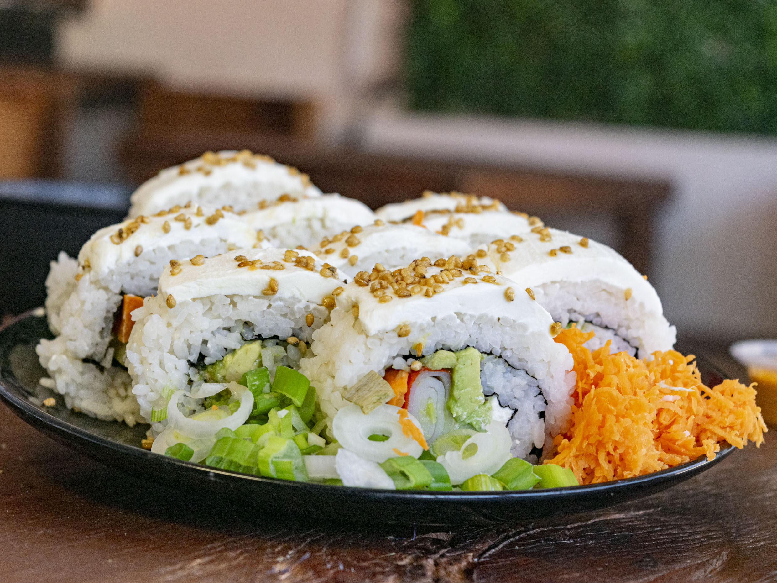 Rollo Fresco, preparado con queso crema, aguacate, pepino, zanahoria, Forrado de laminas de queso crema