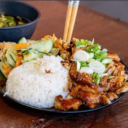 Porción de arroz, pollo bañado en tare, porción de ensalada de la casa, cebollín y ajonjolí.