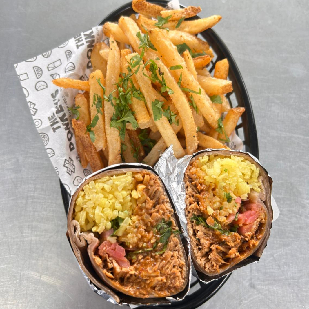 Pechuga en crema de chipotle + arroz + cilantro + cebolla curtida + tortilla de chipotle