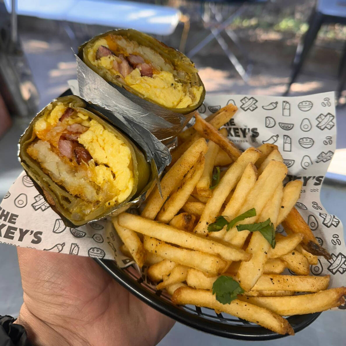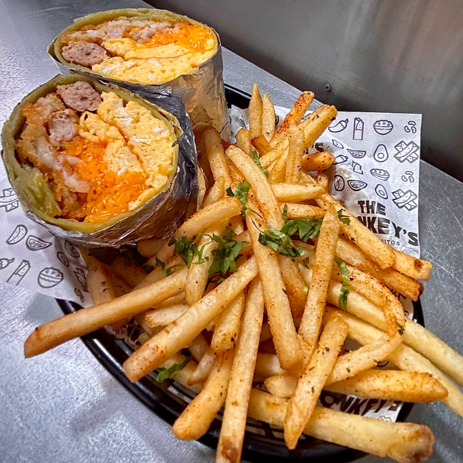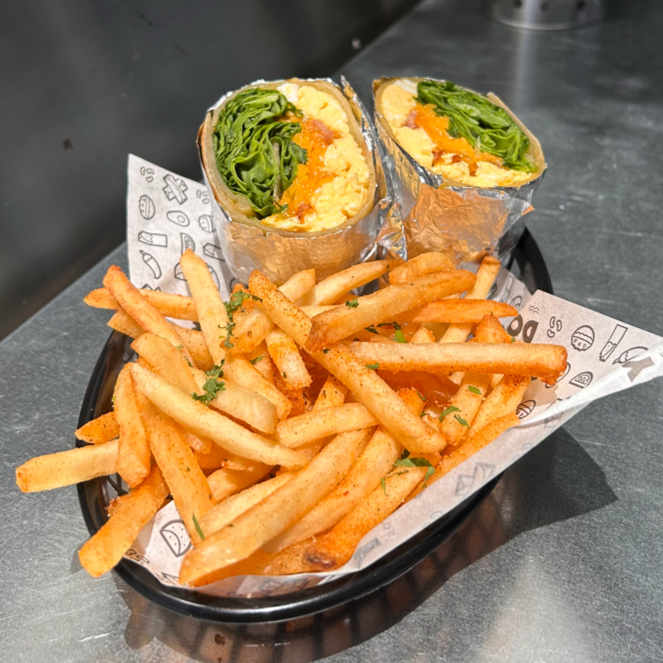 Huevo revuelto + tocino + queso cheddar + espinacas + tortilla de espinacas + papas fritas