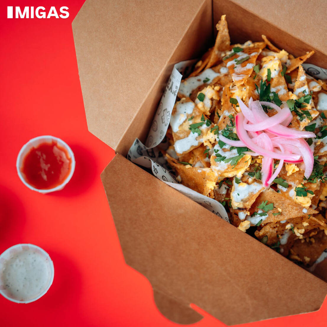 Tortilla de maiz frita + huevo revuelto + cilantro + cebolla curtida + aderezo de habanero tatemado