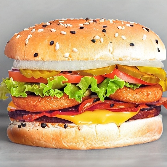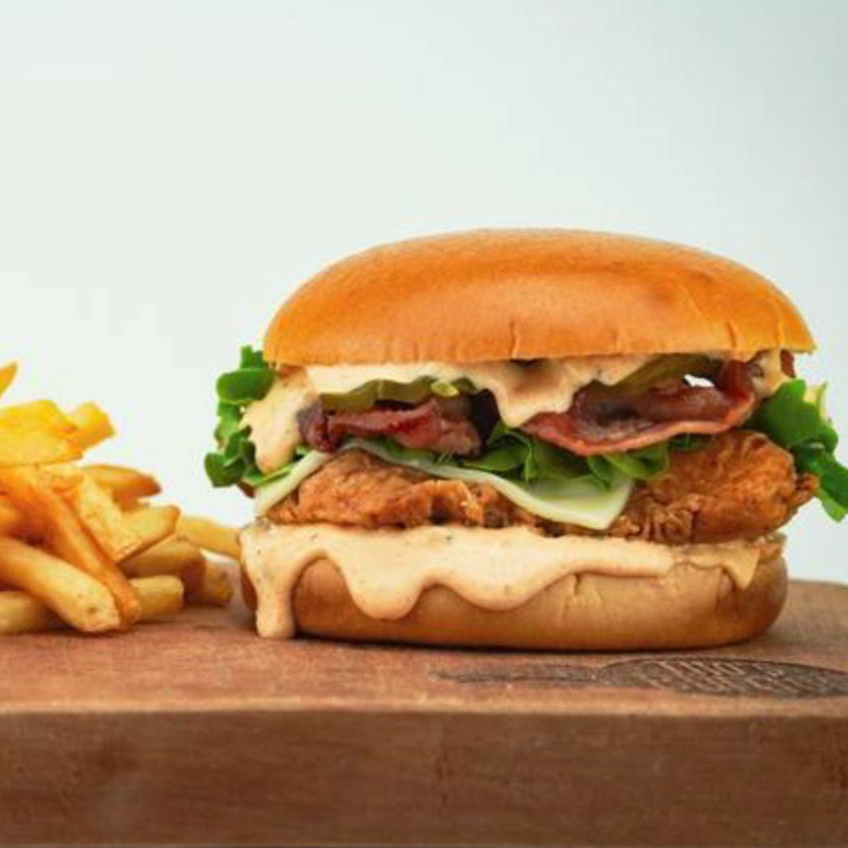 Hamburguesa con pan brioche,pechuga con empanizado crujiente,queso suizo,tocino, lechuga y aderezo de la casa.
