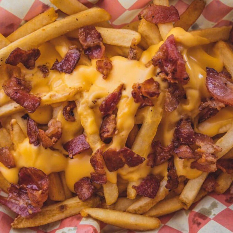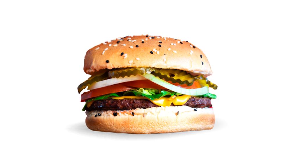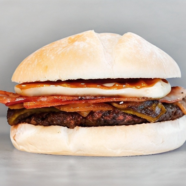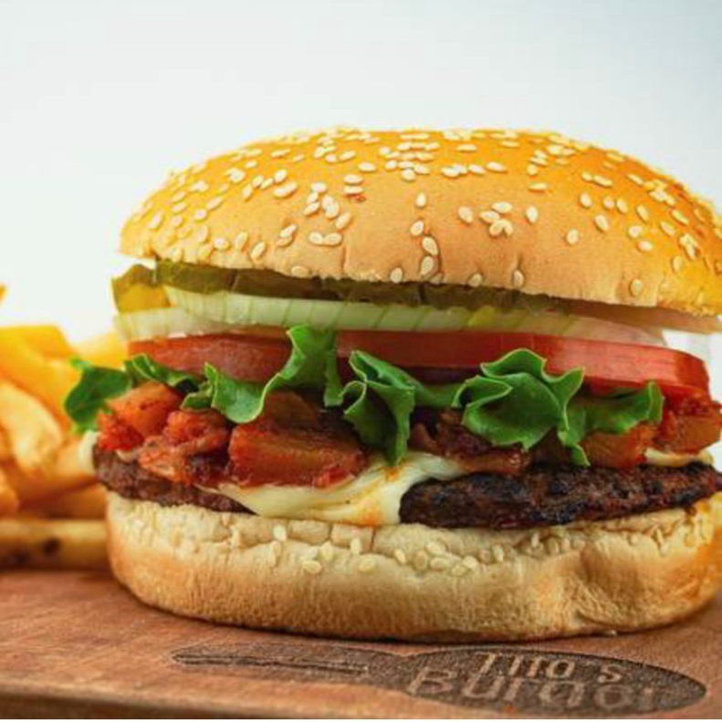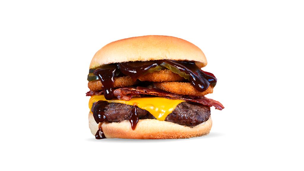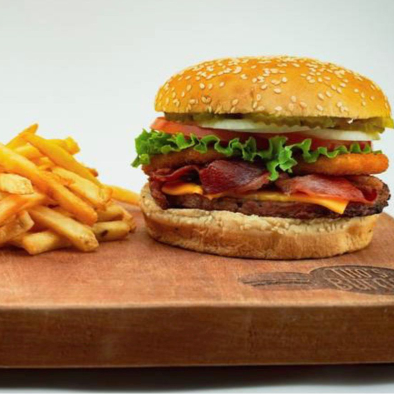 Hamburguesa de pan brioche,carne de costilla 230gr,BBQ de la casa,queso americano,tocino crujiente, pepinillos y aros de cebolla,papas a la francesas y bebida.