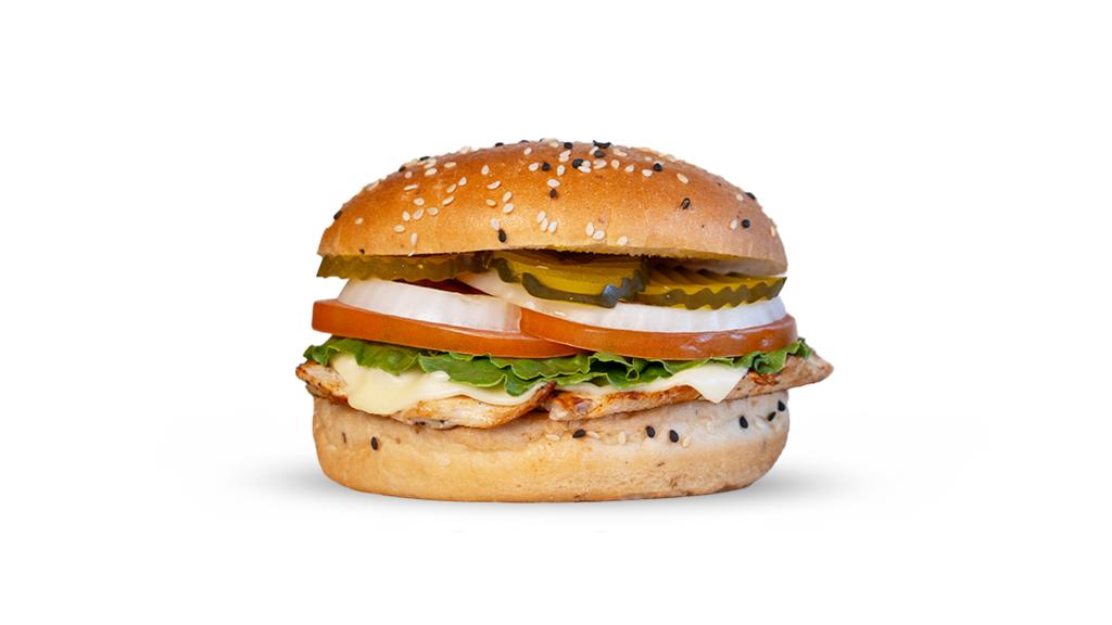 Hamburguesa Sencilla de pollo a la plancha,queso suizo, papas a la francesa y bebida.