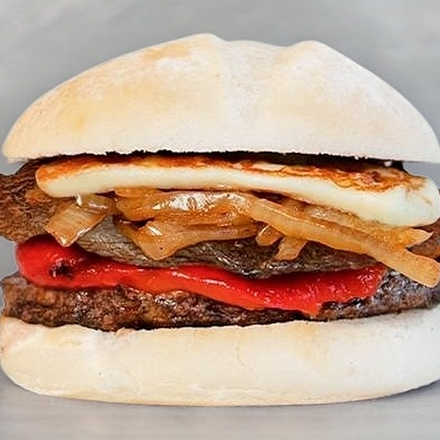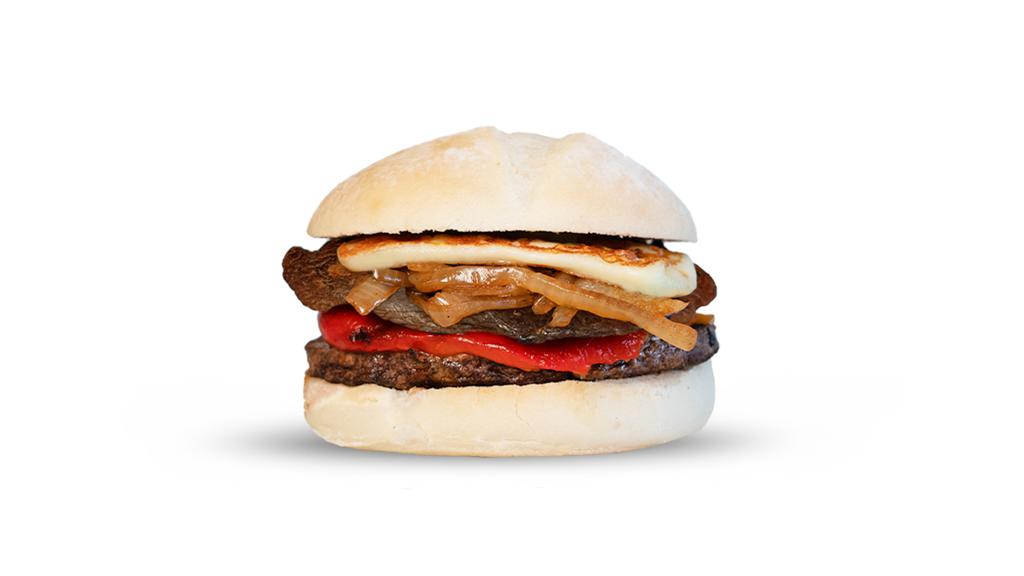 Pan artesanal,hongo portobello,pimiento rojo a la parrilla,cebolla caramelizada, queso del Real y mayonesa.