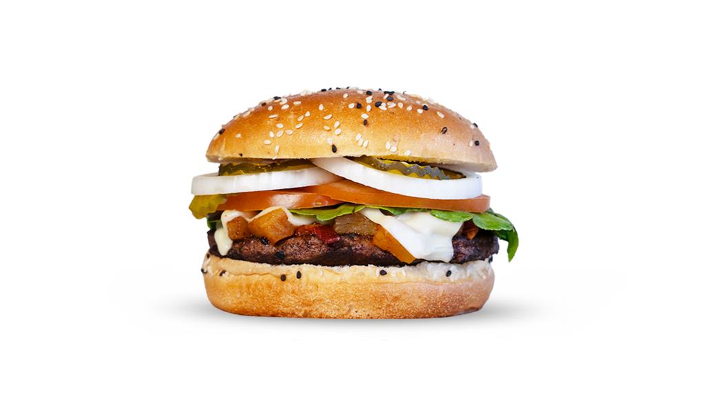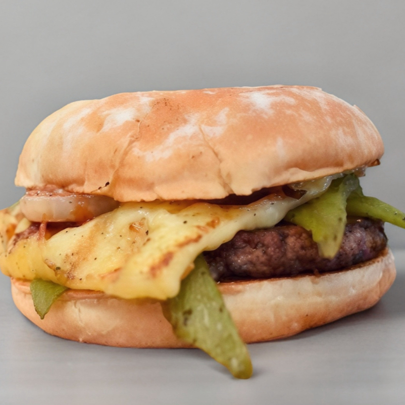 Hamburguesa con pan artesanal,rajas de chile California a la parrilla,tocino,cebolla guisada y queso del Real.