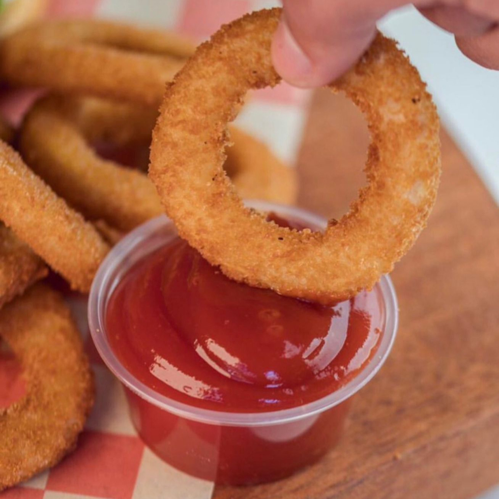 Hamburguesa con aros y tocino, papas a la francesa y bebida.