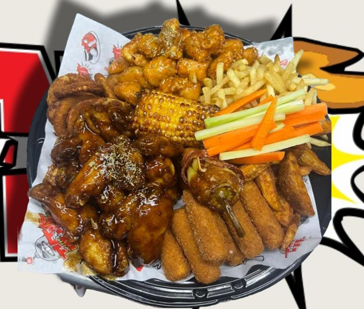 Alitas, papas de gajo, papas a la francesa, aros de cebolla, chile caribe, elote, dedos de queso, zanahoria, apio y ranch.