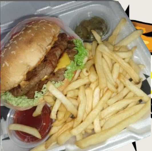 Hamburguesa doble carne, doble queso, cebolla, tomate, lechuga.