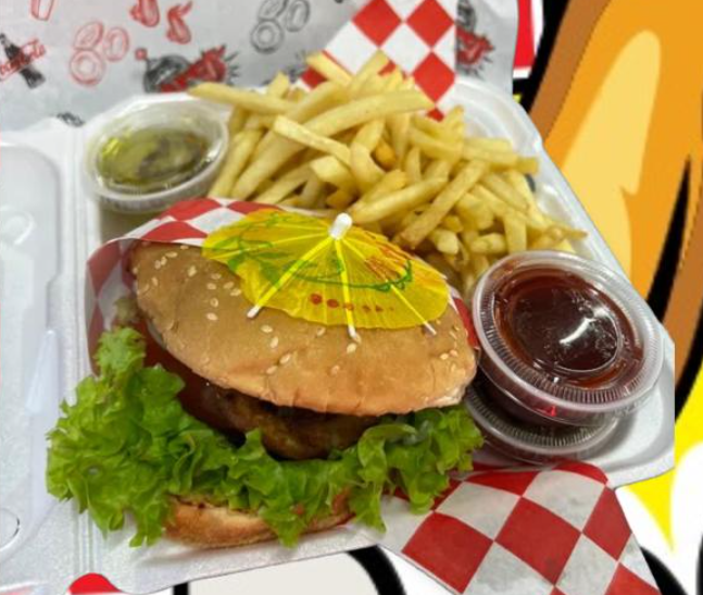 Hamburguesa 1 carne con queso, aros de cebolla, tocino, cebolla, tomate y lechuga.